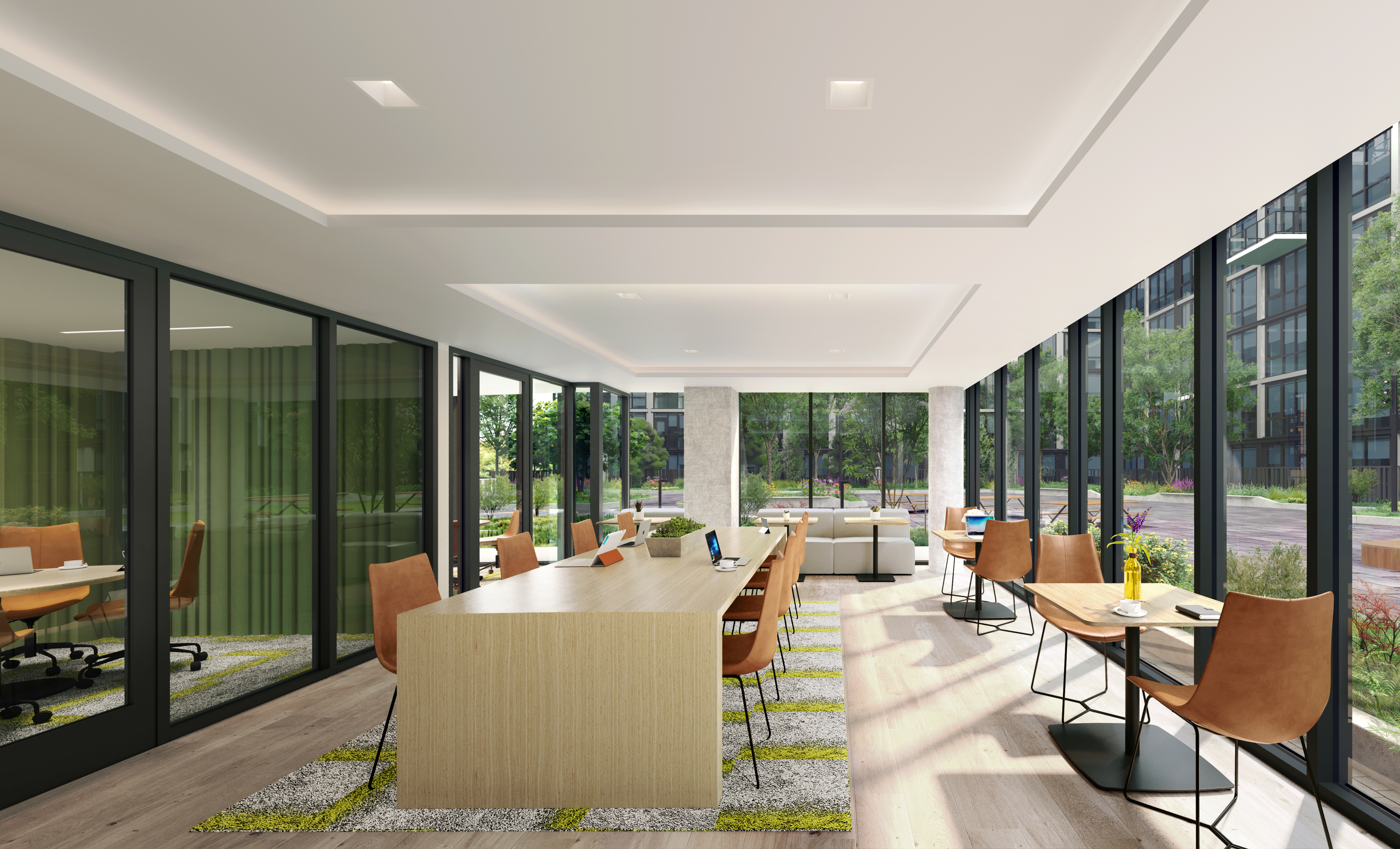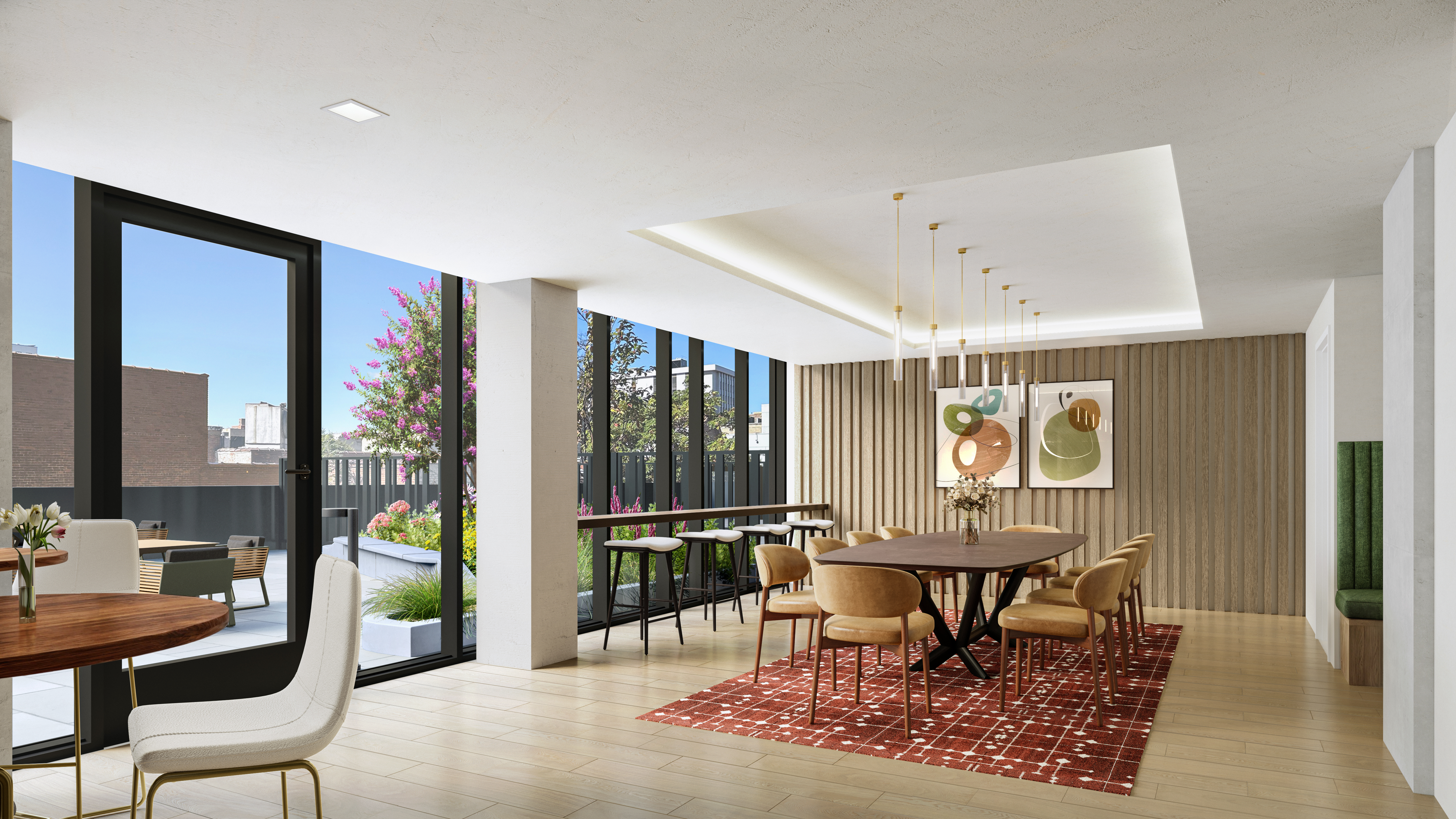 Residences showcase thoughtful, open layouts with custom oversized windows and ceilings that soar up to nine feet. Kitchens boast soft-close walnut cabinetry, Carrera white quartz countertops, polished white ceramic tile backsplashes, and a full suite of GE stainless steel appliances. Bathrooms pair full-height white porcelain wetwalls with gray porcelain tile floors, wall-mounted white vanities with white ceramic countertops, brushed chrome fixtures, and custom matte black medicine cabinets. Select homes offer private patios and terraces. Each residence is additionally outfitted with individual heating and cooling, a Bosch washer and dryer, and complimentary installed roller shades, including blackout shades in the bedrooms.