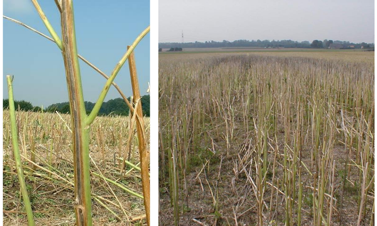 Abb. 2: Nach der Rapsernte: grüne und mit Verticillium longisporum infizierte braune Stoppeln