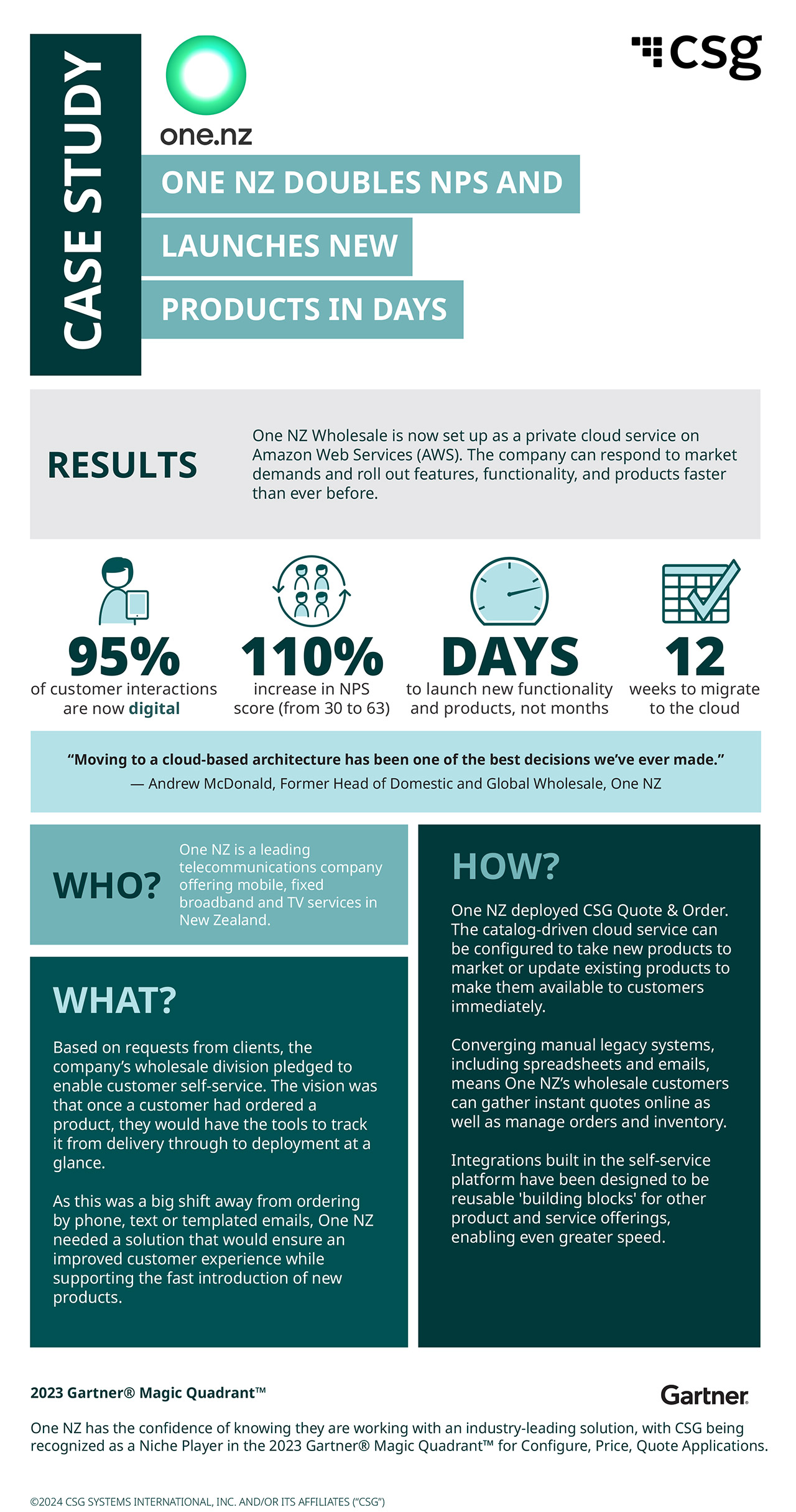 One NZ has the confidence of knowing they are working with an industry-leading solution, with CSG being recognized as a Niche Player in the 2023 Gartner® Magic Quadrant™ for Configure, Price, Quote Applications.