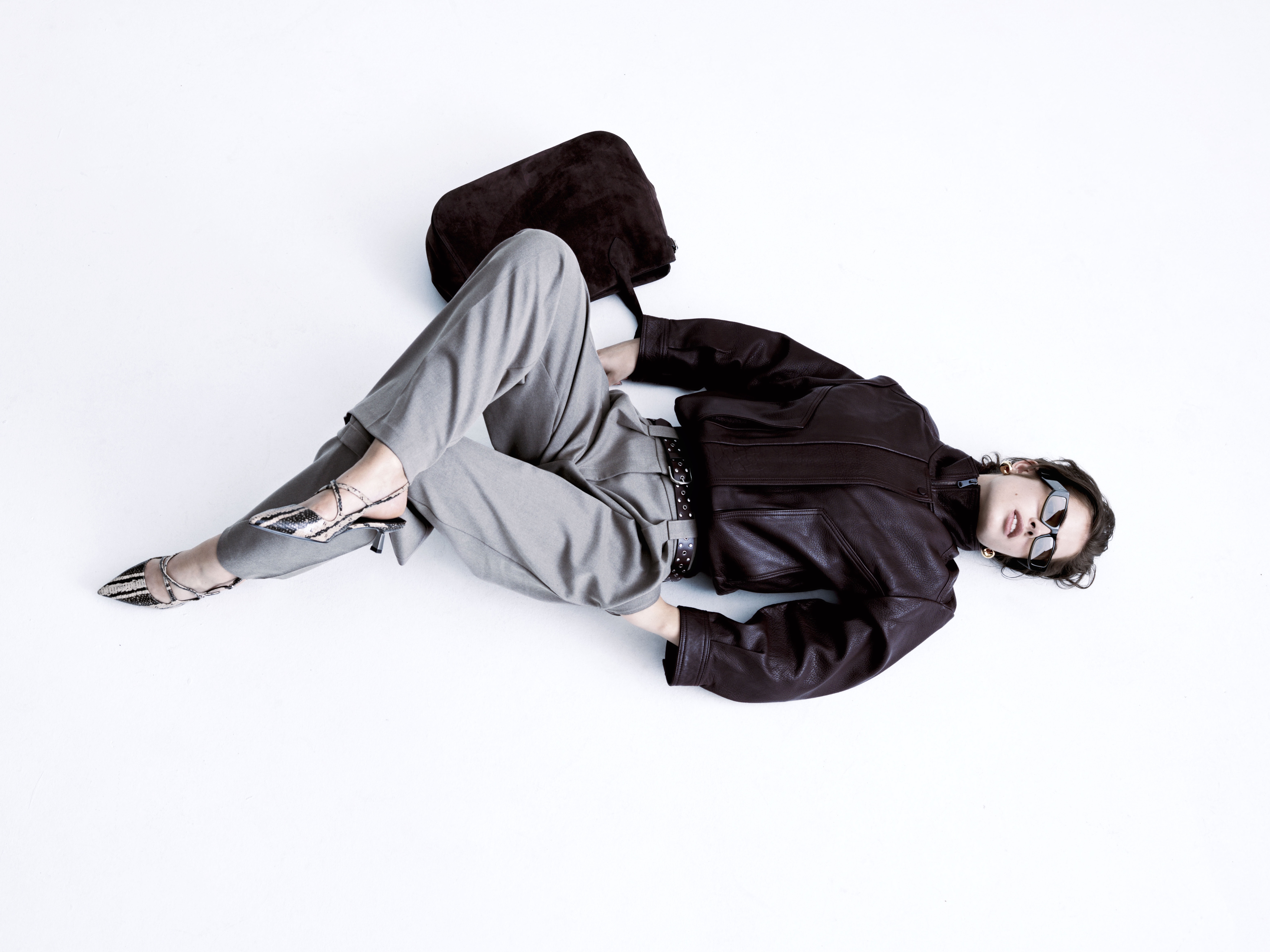 Lily wears Reiss jacket and trousers, Hush belt, Charles & Keith heels, Reformation bag and sunglasses, Missoma earrings