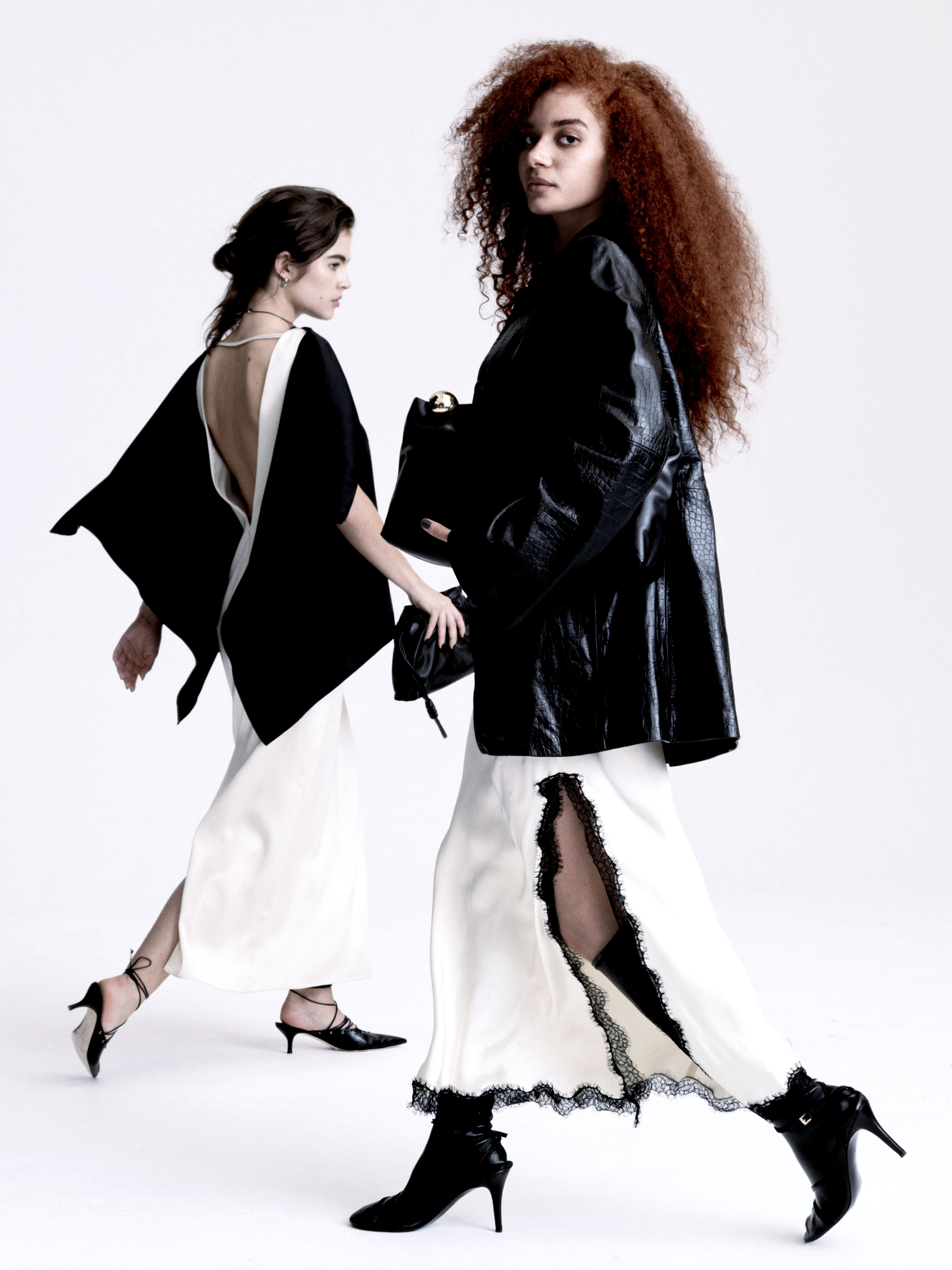 Lily wears Arrange dress, Russell & Bromley heels, Nobody’s Child bag, Lines and Current earrings and necklace Rayan wears & Other Stories jacket, Mango dress, boots and bag, Lines and Current earrings