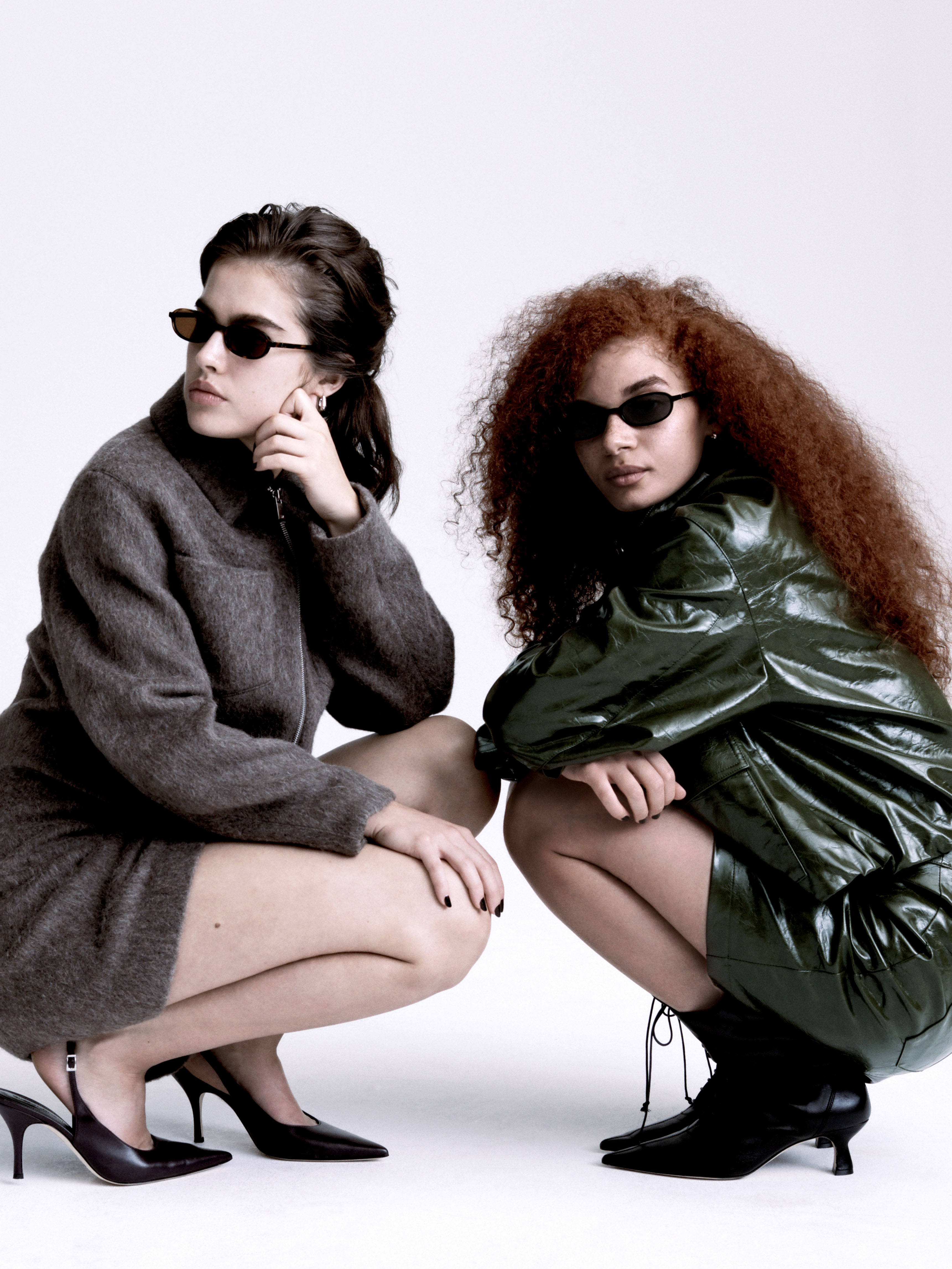 Lily wears Whistles jacket and skirt, Russell & Bromley heels, Jimmy Fairly sunglasses, Lines and Current earrings Rayan wears River Island jacket and skirt, Russell & Bromley boots, Jimmy Fairly sunglasses, Lines and Current earrings