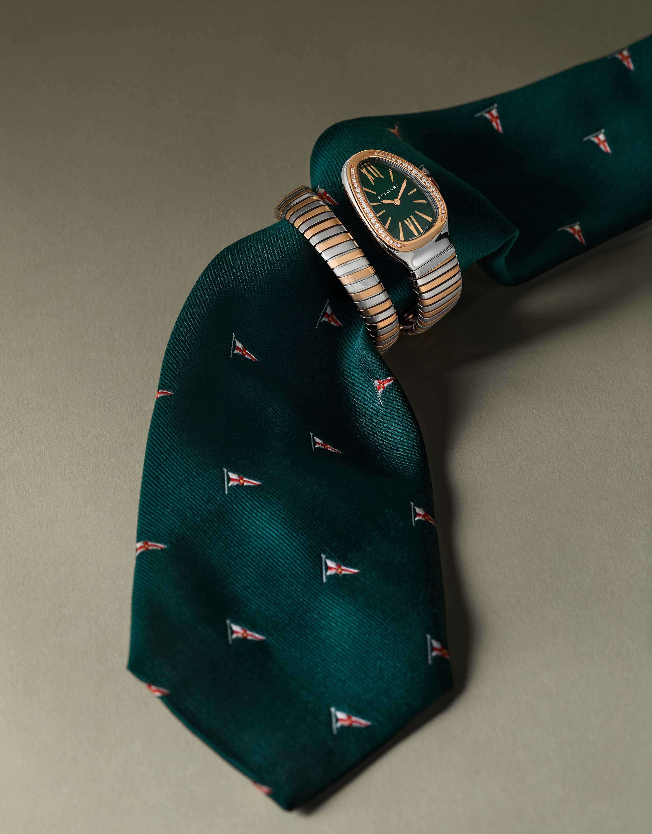 When it comes to watches, it doesn’t get much more iconic than the Bulgari Serpenti. This watch has been snaking round the wrists of the well dressed since the 1960s, and this model, with its green lacquer soleil dial and diamond edges, feels just as alluring today. The bi-colour model gives a glimpse into the craft story