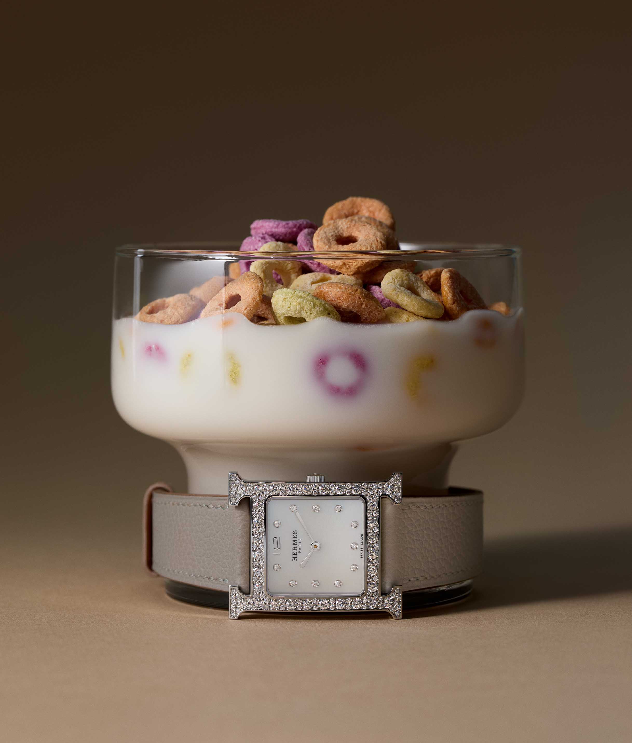 If you’ve no time for waiting lists, skip the bags and go straight to the watch department for a little bit of Hermès magic. This Heure H model is a 90s classic, updated with luxurious diamond setting and a creamy palette. There are 132 diamonds set into the iconic H-shaped case, and 11 more marking the hours of the mother-of-pearl dial. The off-white strap is super chic,