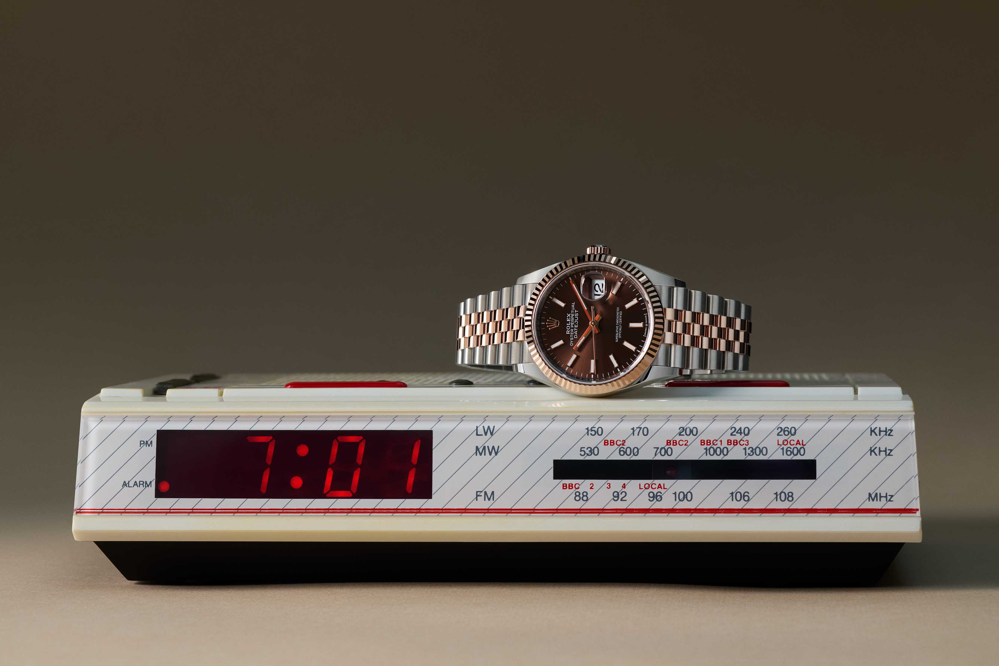 This model has all iconic features – fluted bezel, jubilee bracelet, date window at 3 o’clock – and a colour palette that captures the rich softness permeating the best watches right now. The smooth chocolate-brown sunray dial melts perfectly into the rose gold accents on the dial, bezel and bracelet. It’s the ‘mocha mousse' of luxury watches.