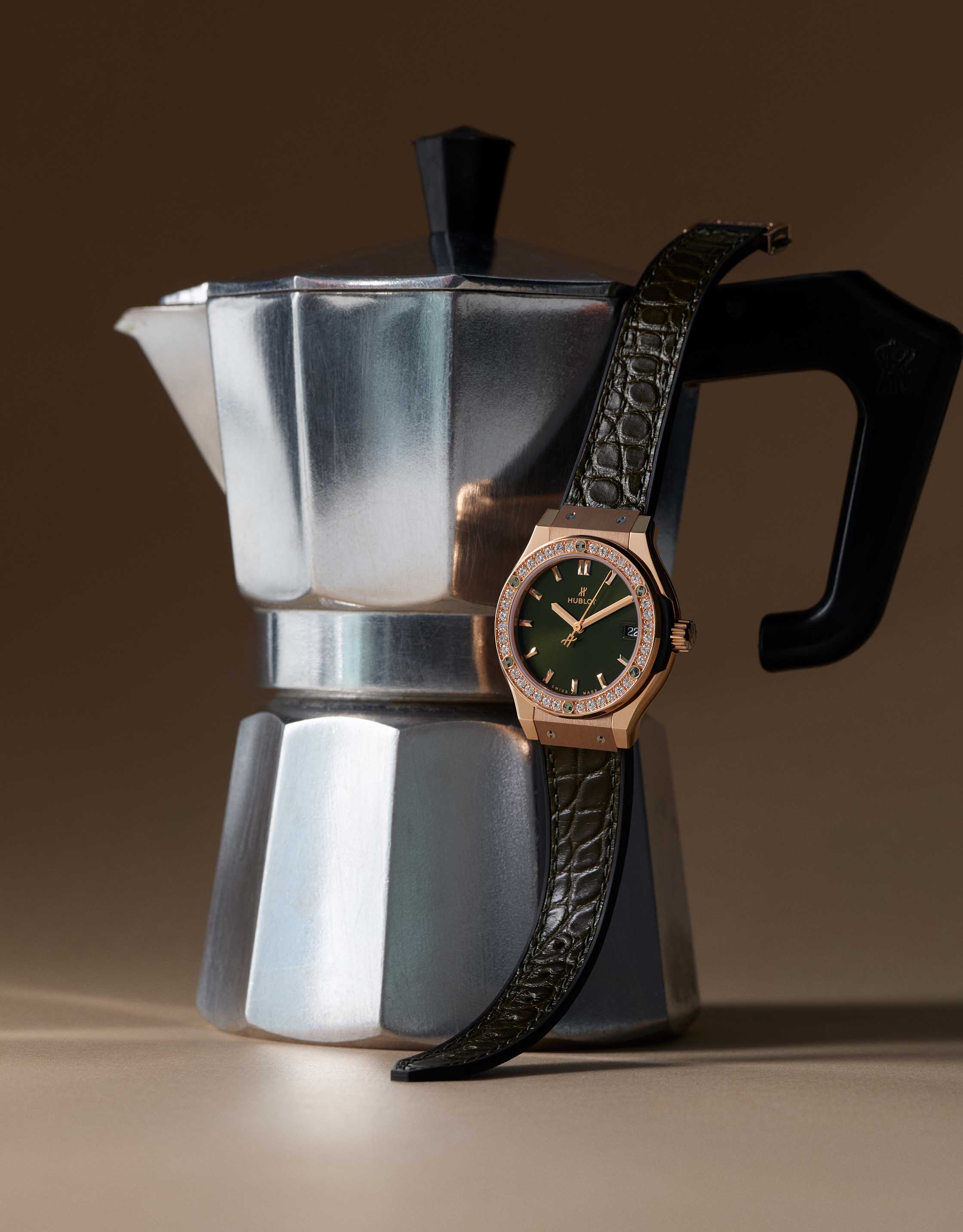 Deep-forest green and rose gold is a combination you might not have known you needed – until now. By introducing this unusual colour combination, Hublot manages to temper the industrial edge of its angular Classic Fusion case (with visible screw heads) and make it feel softly luxe. The depth of the verdant sunray dial and rubber strap is complemented by the soft-focus satin finish on the gold, and a simple, clean ring of brilliant diamonds on the bezel, ensuring calm confidence.