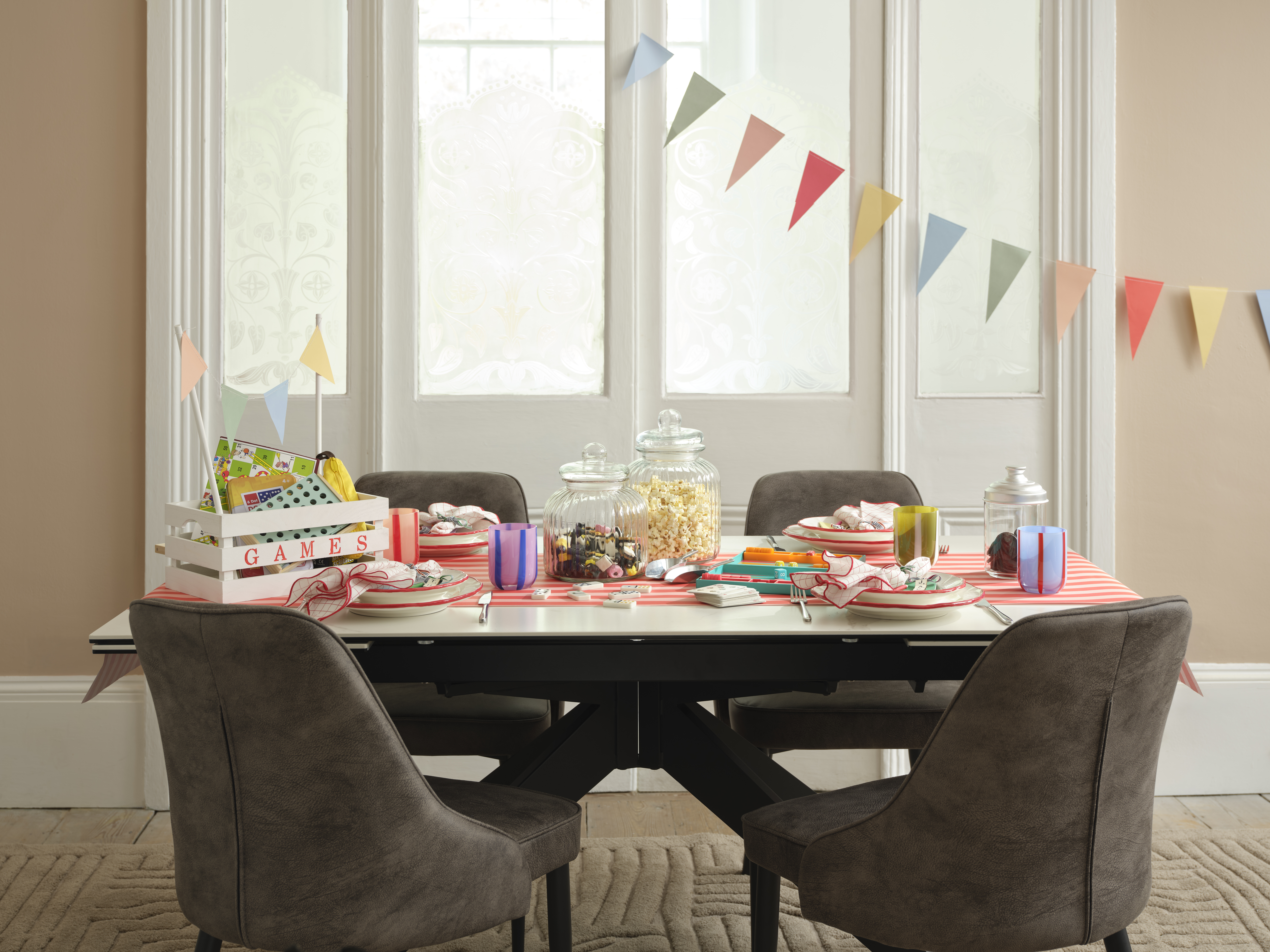 If you’re stuck on what to do on a rainy Saturday, nothing beats an afternoon of games. Style your dining table with a touch of whimsy, topping a brightly-coloured striped table runner with jars of pick’n’mix and popcorn – perfect for grazing on as the games commence.