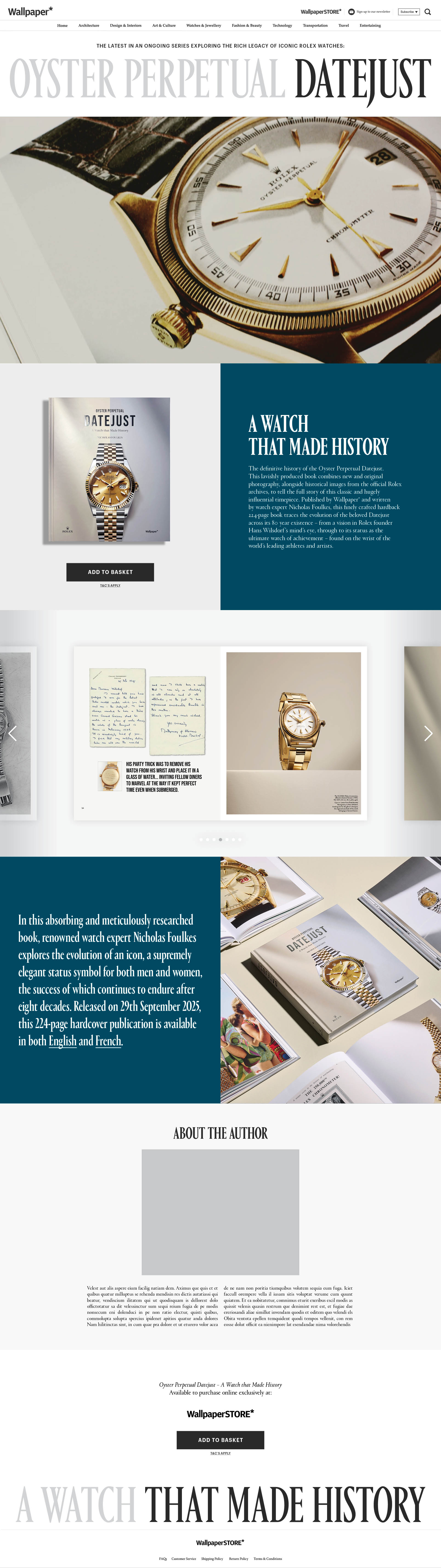 The definitive history of the Oyster Perpetual Datejust.This lavishly produced book combines new and original photography with historical images from the official Rolex archives to tell the full story of this classic and hugely influential timepiece. Published by Wallpaper* and written by watch expert Nicholas Foulkes, this finely crafted 224-page hardback traces the evolution of the beloved Datejust across its 80-year history – from a vision in Rolex founder Hans Wilsdorf’s mind, to its status as the ultimate symbolof achievement, found on the wrists of the world’s leading athletes and artists. An essential acquisition for any watch aficionado, Oyster Perpetual Datejust – A Watch that Made History is the first officially sanctioned account of one of the world’s most influential watches.