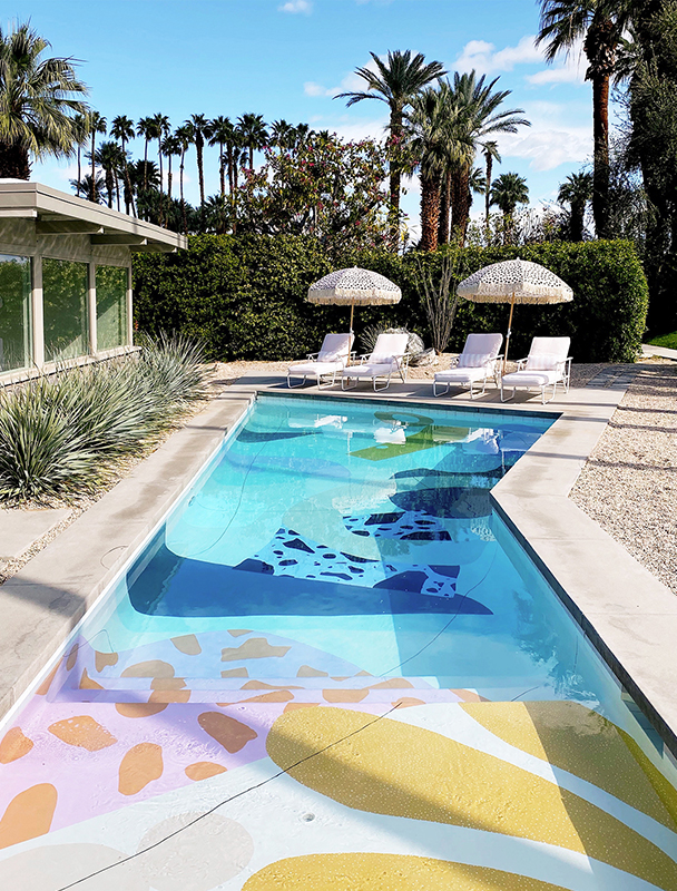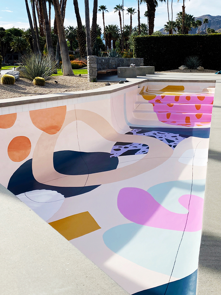 For the first time, artist and Studio Proba founder Alex Proba, known for translating her colorful abstractions onto rugs, countertops, ceilings, and exteriors, had a swimming pool as her canvas.
