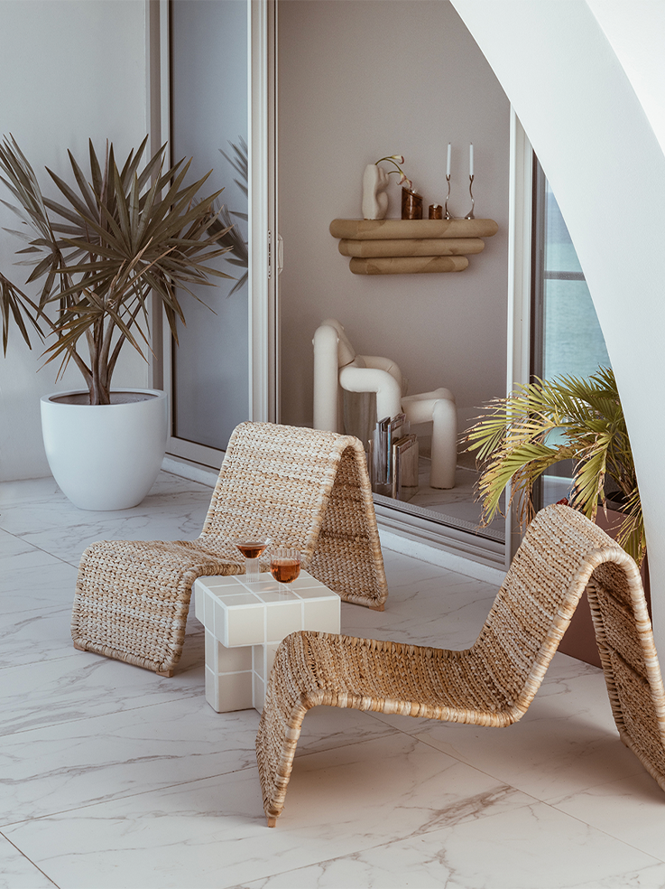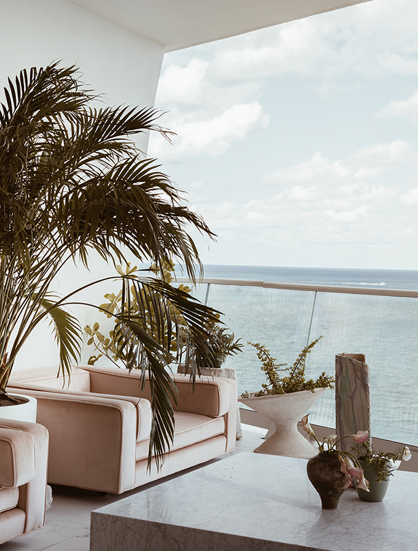 Velvet can so be for outdoor spaces. When this New Jersey native moved to Miami, she worked with Tiffany Howell of Night Palm Interiors to kit out her balcony in plush oversize lounge chairs for taking in the east-to-west ocean views in “’80s Miami sex den” style. Don’t worry; the fabric is all-weather in case of thunderstorms.