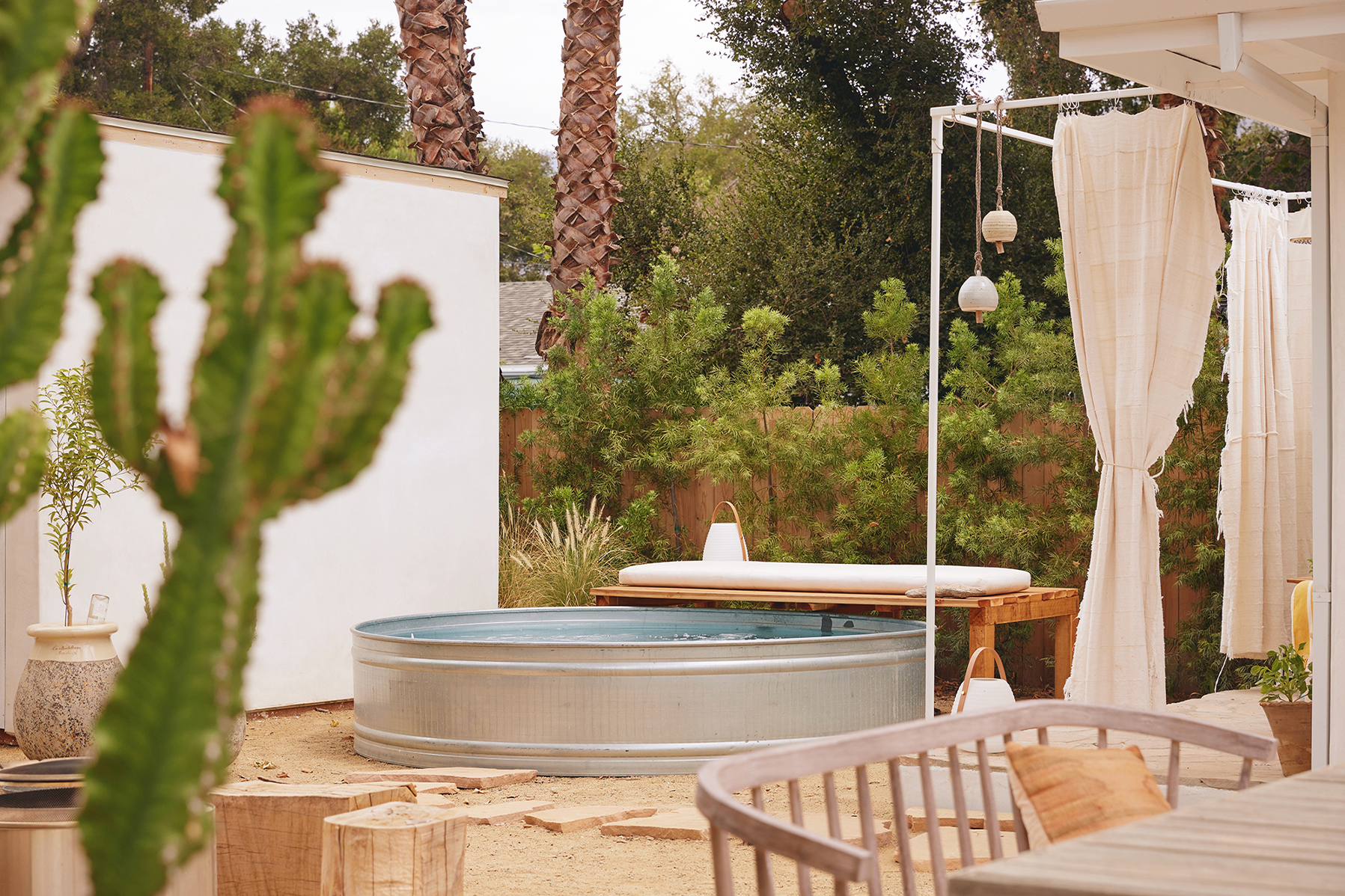 Drawing on the rustic minimalism she fell in love with in Portugal, Gowdy eschewed an in-ground pool and went with a stock tank, the only place you want to be on a 105-degree summer day. Plus not digging a hole allowed room in her budget for a storage unit, photo studio, and outdoor shower.