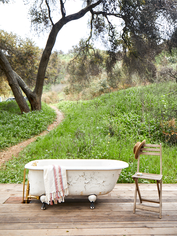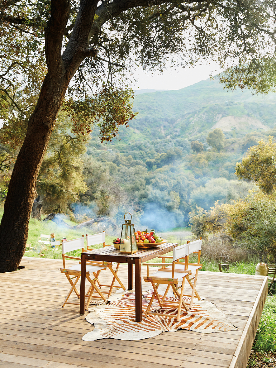 It’s hard not to feel one with nature when your patio is strategically positioned to watch the sun set over the mountains, and you have your choice of front-row seats: an alfresco claw-foot tub or outdoor kitchen-bar. Before it gets too dark, everyone pitches their tents underneath the swooping oaks in the grass beyond. In the morning, the flowering apple, pear, apricot, avocado, and walnut trees provide breakfast.