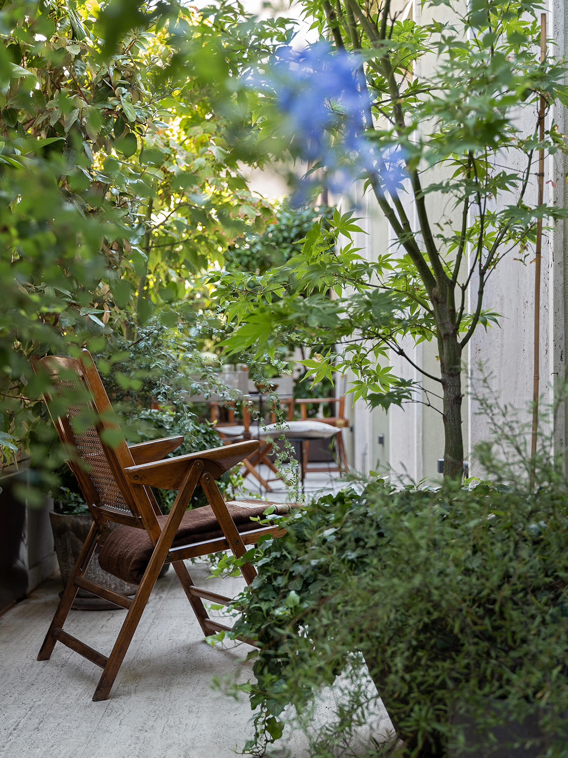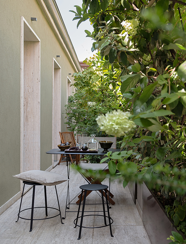 The floor-to-ceiling glass doors, which highlight the veranda that runs the length of the entire flat and effectively expand the kitchen, living room, and bedroom footprints. Bertolini paved the terrace with unpolished slabs of travertine and planted tall maple trees, Mediterranean myrrh, and hydrangeas for a treehouse feel in the middle of the city.