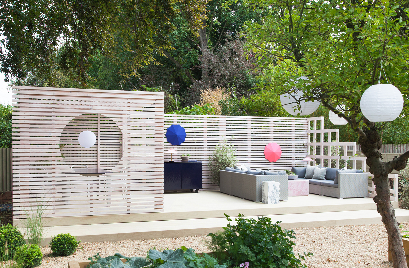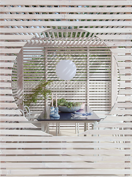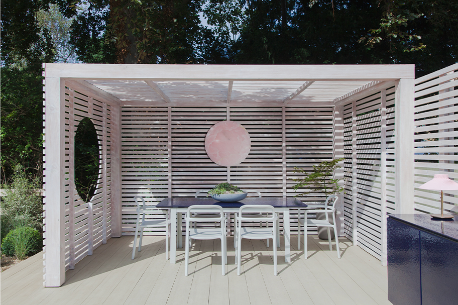 At 32 feet wide and 16 feet deep, the couple’s deck can handle yoga sessions just as effortlessly as weekend cookouts. The flooring is made of hard-wearing, easy-to-clean composite boards, while the slatted larch-wood walls and round cutout beckon you to come join the fun. To keep the revelry going into the evening hours, the pair hardwired a pendant light over the dining table during construction.