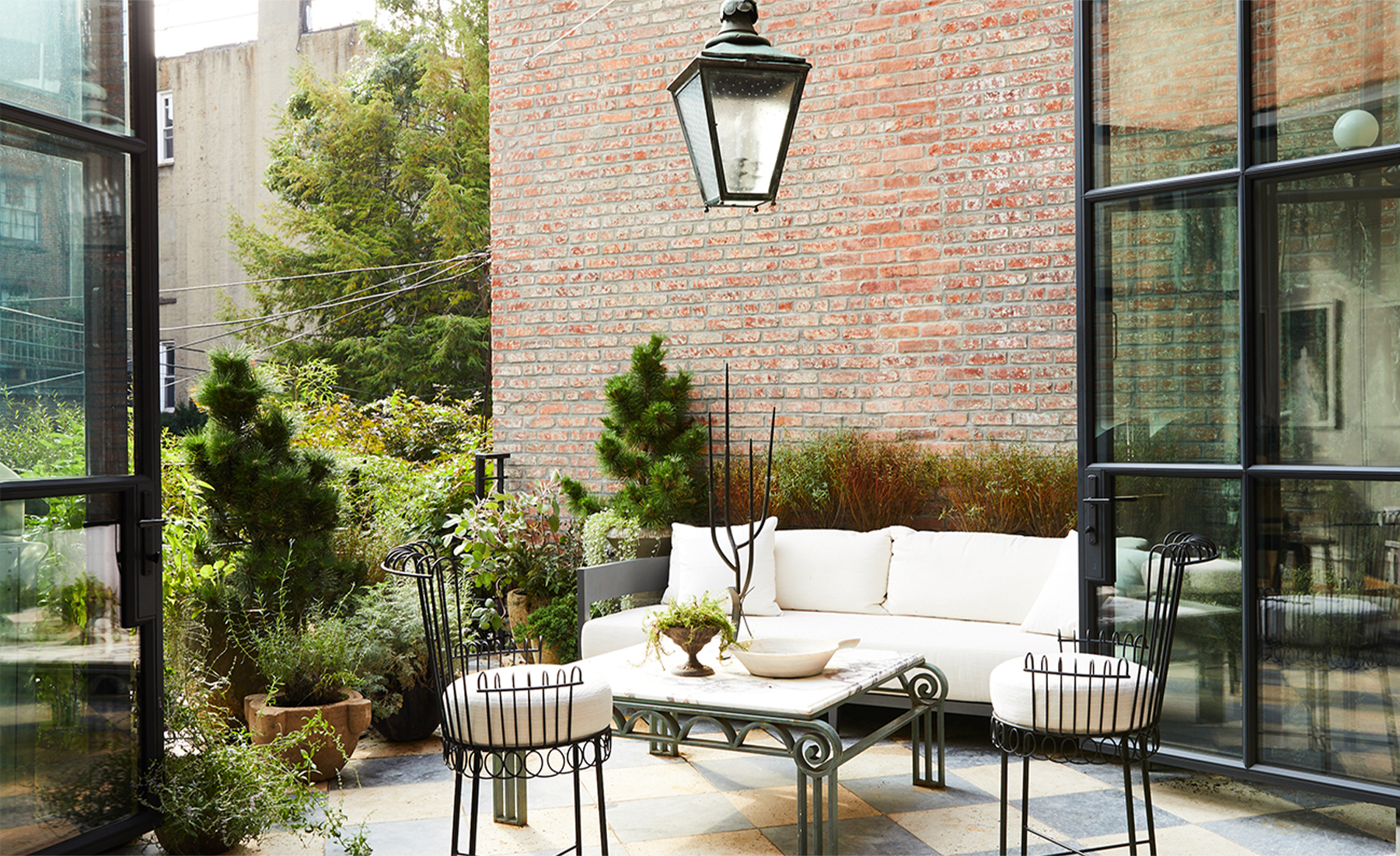 Calderone laid the foundation for a French château look to the tune of just $7 per square foot. “Those checkered floors make my heart go pitter-patter,” she says of her terrace’s blue-gray marble and sandy travertine tiles, sourced through a stone company in New Jersey. Her second scrappy score? The marble top on the 1930s Art Deco coffee table—it’s a leftover chunk of stone from someone else’s kitchen renovation.