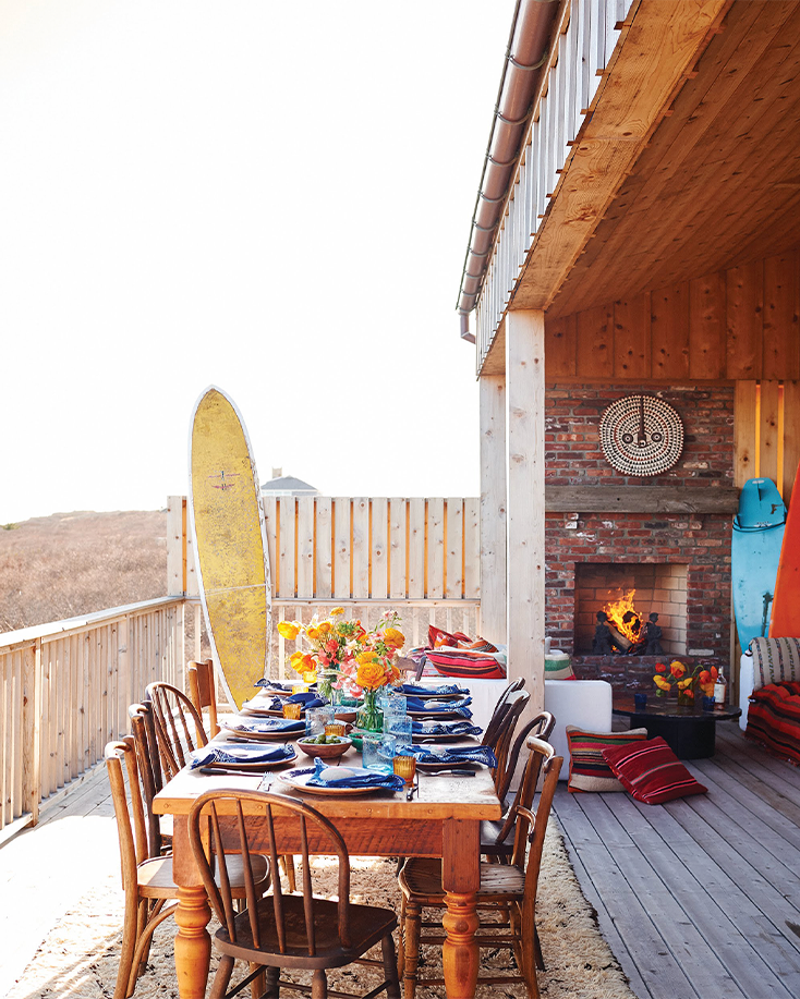 Who needs a palatial Hamptons estate when you could have this couple’s “cross between a fort and a surf shack,” as they lovingly describe it? For fuss-free, post-beach hangouts, they keep it casual by using ocean finds like driftwood and smooth painted stones as place settings and layer colorful Moroccan pillows and blankets over the sofas.