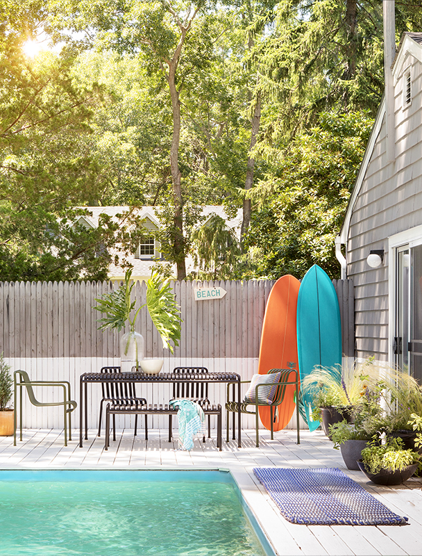 The outdoor space was the very first spot the couple decided to furnish in their Hamptons home—that’s how much they knew they’d be using it. When the fencing was still lacking a certain something, Campanaro bought a few gallons of white paint. She emulated the dipped stools the duo had spotted online and applied the paint only halfway up the pickets. The look worked so well that she kept the division going onto the house, too.