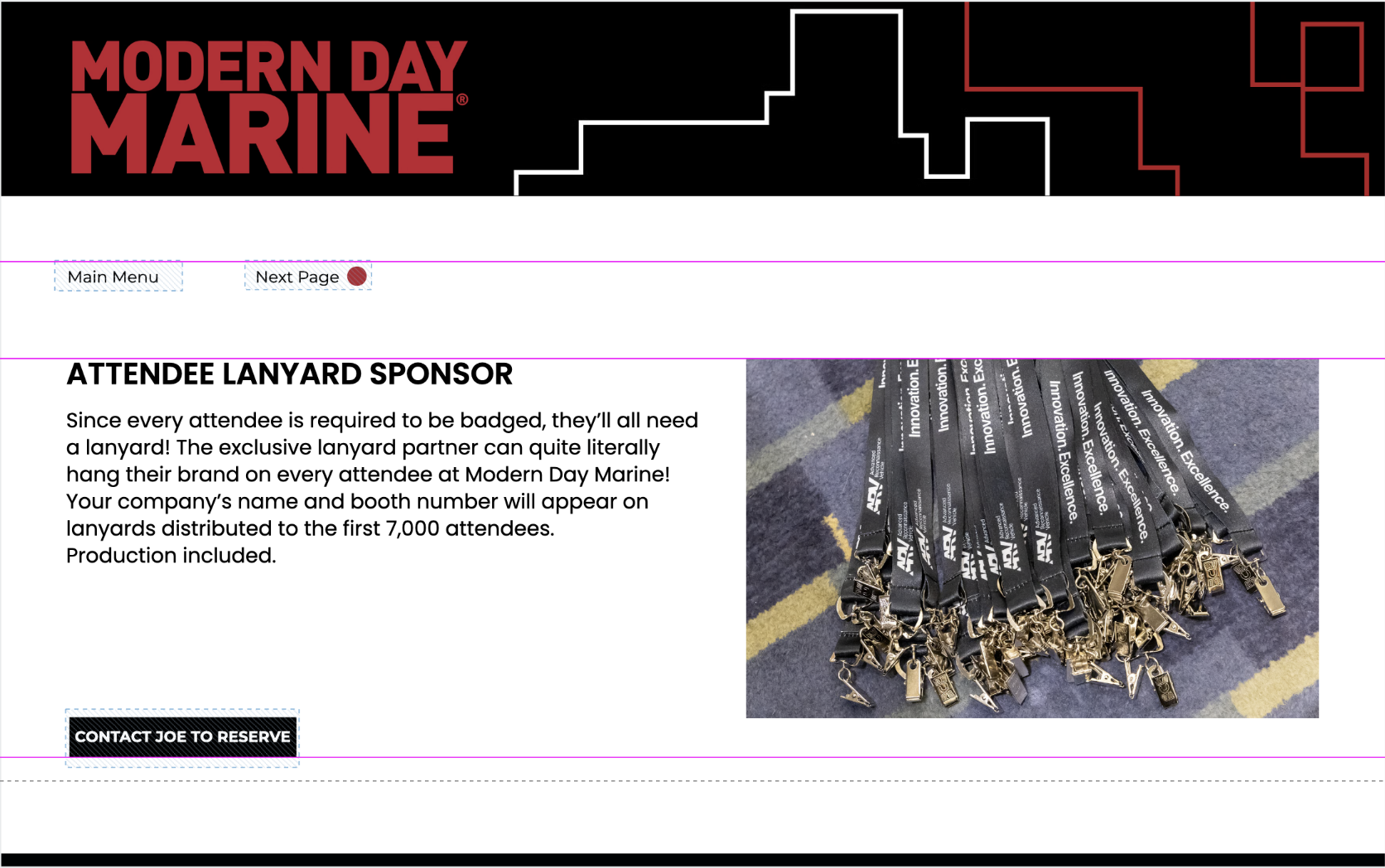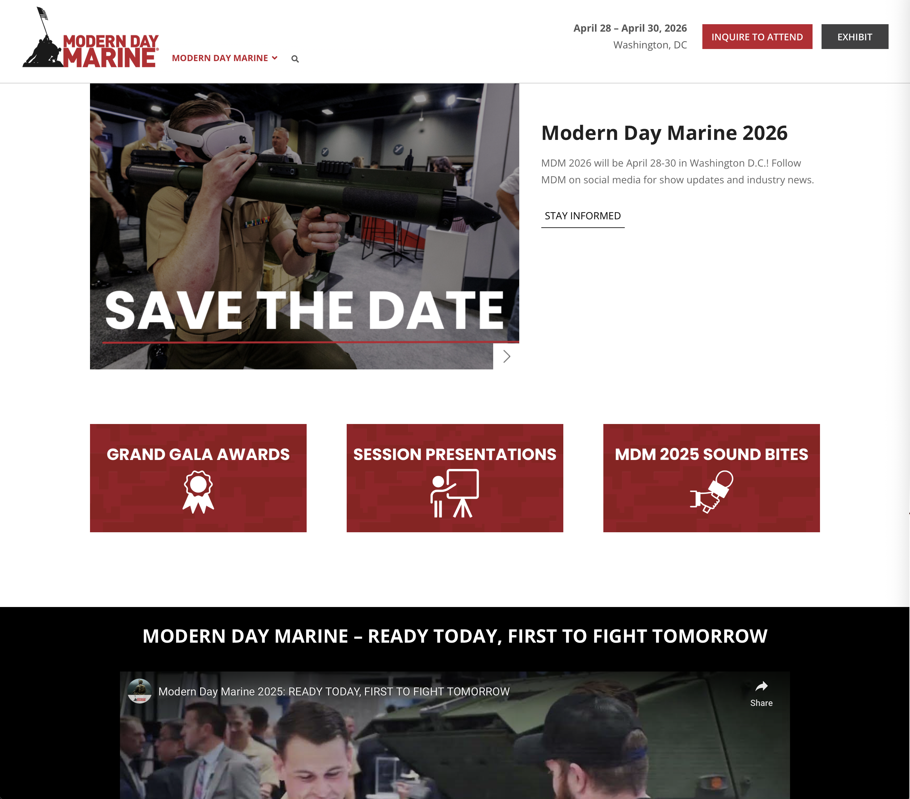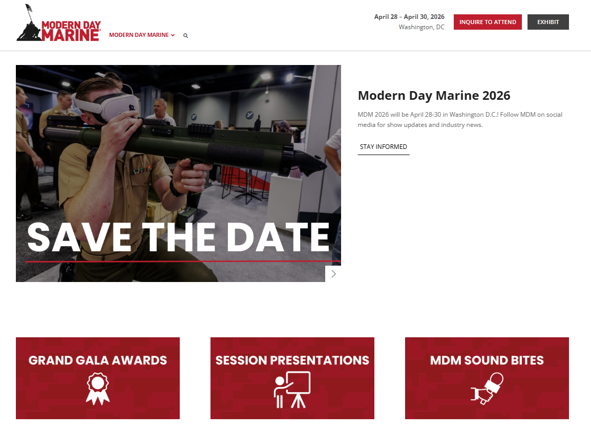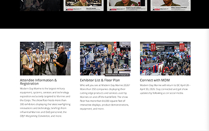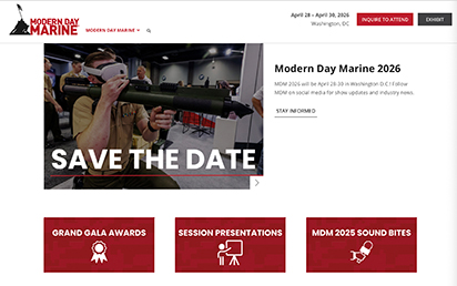 Let Visitors see what you have to offer before, during, and after the event by placing your ad on the MDM website. Leaderboard ads will appear at the top of website pages. Footer ads will appear on the bottom of website pages. Navigation menu ads appear in the drop down menu for Modern Day Marine site navigation. Leaderboard Ad $3,300 1 month, 3 available Leaderboard Ad $2,640 3+ months, 1 available Footer Ad $1,650 1 month, 3 available Footer Ad $1,230 3+ months, 1 available Navigation menu ads $2,640 1 month, 3 available Navigation menu ads $2,310 3+ months, 1 available