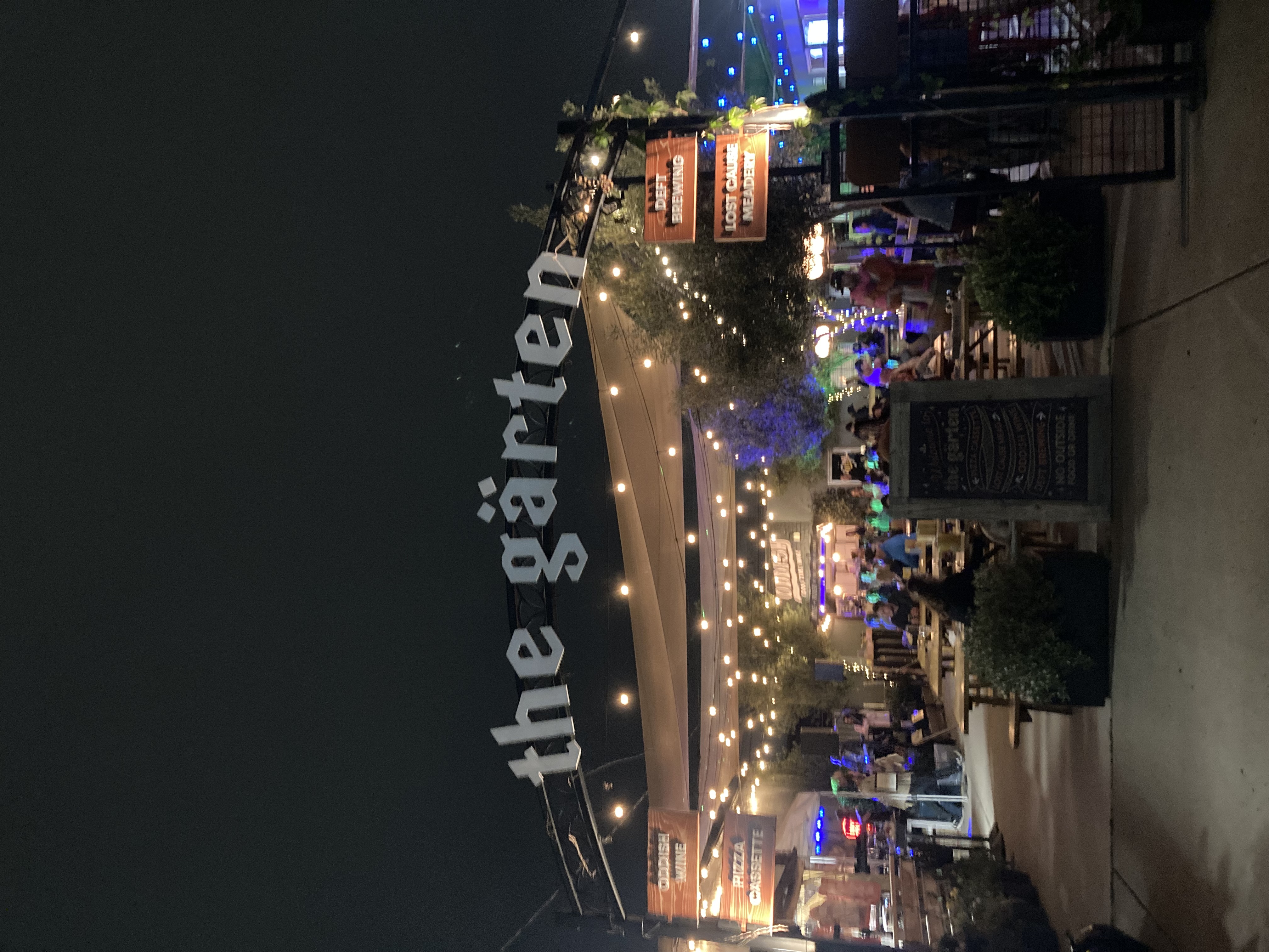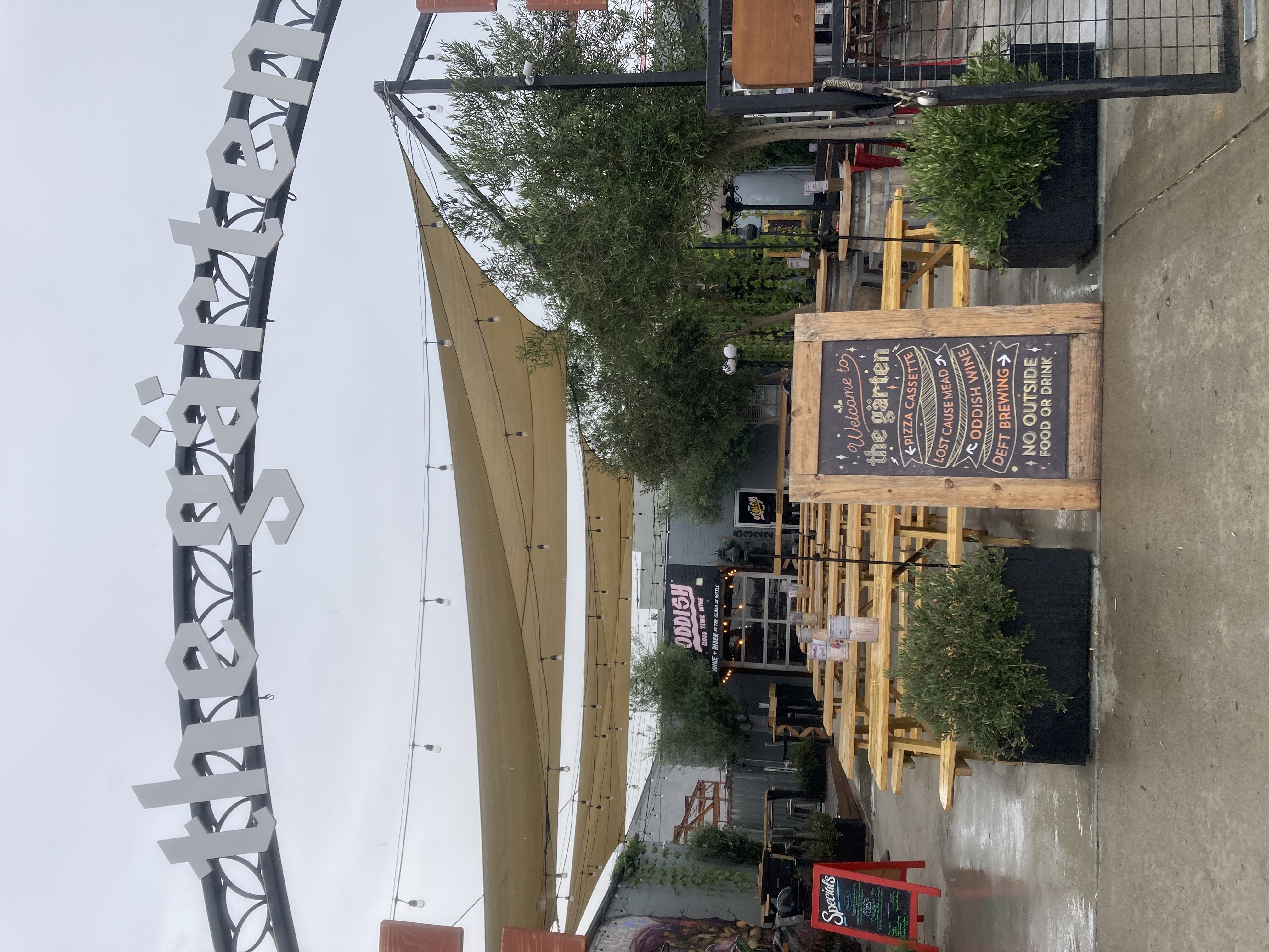 Pizza Cassette in San Diego is an outdoor pizzeria located in a beer garden, featuring a live music venue with the seating, kitchen, and stage outdoors. The space, centered around a Valoriani wood-burning oven, transforms into an intimate, tent-covered setting during winter, offering a full menu despite its unique, open-air setup.