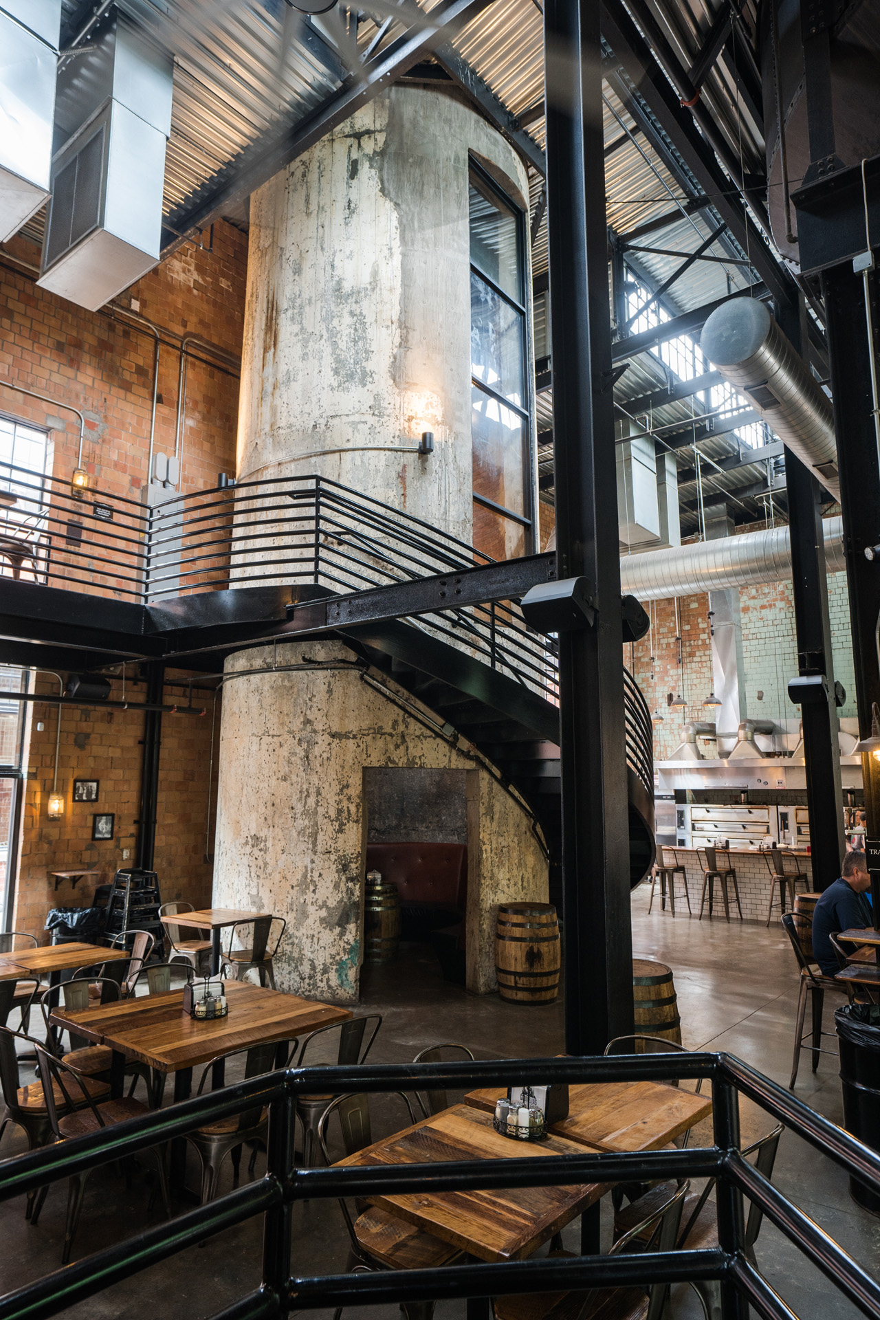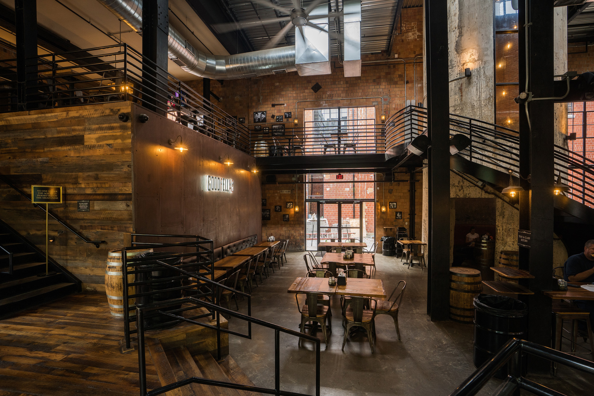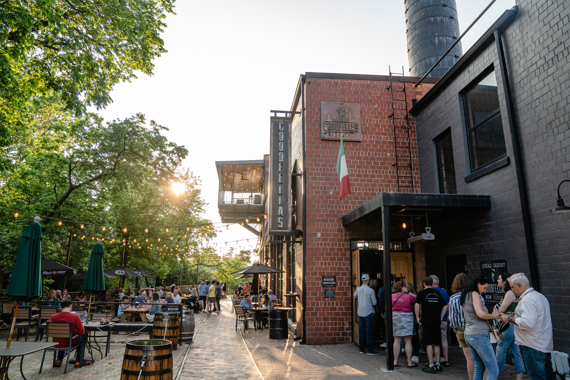 Goodfellas Pizzeria in Lexington's Distillery District offers a unique dining experience with a renovated industrial space, featuring a 105-foot smokestack, vintage decor, and a craft cocktail bar.