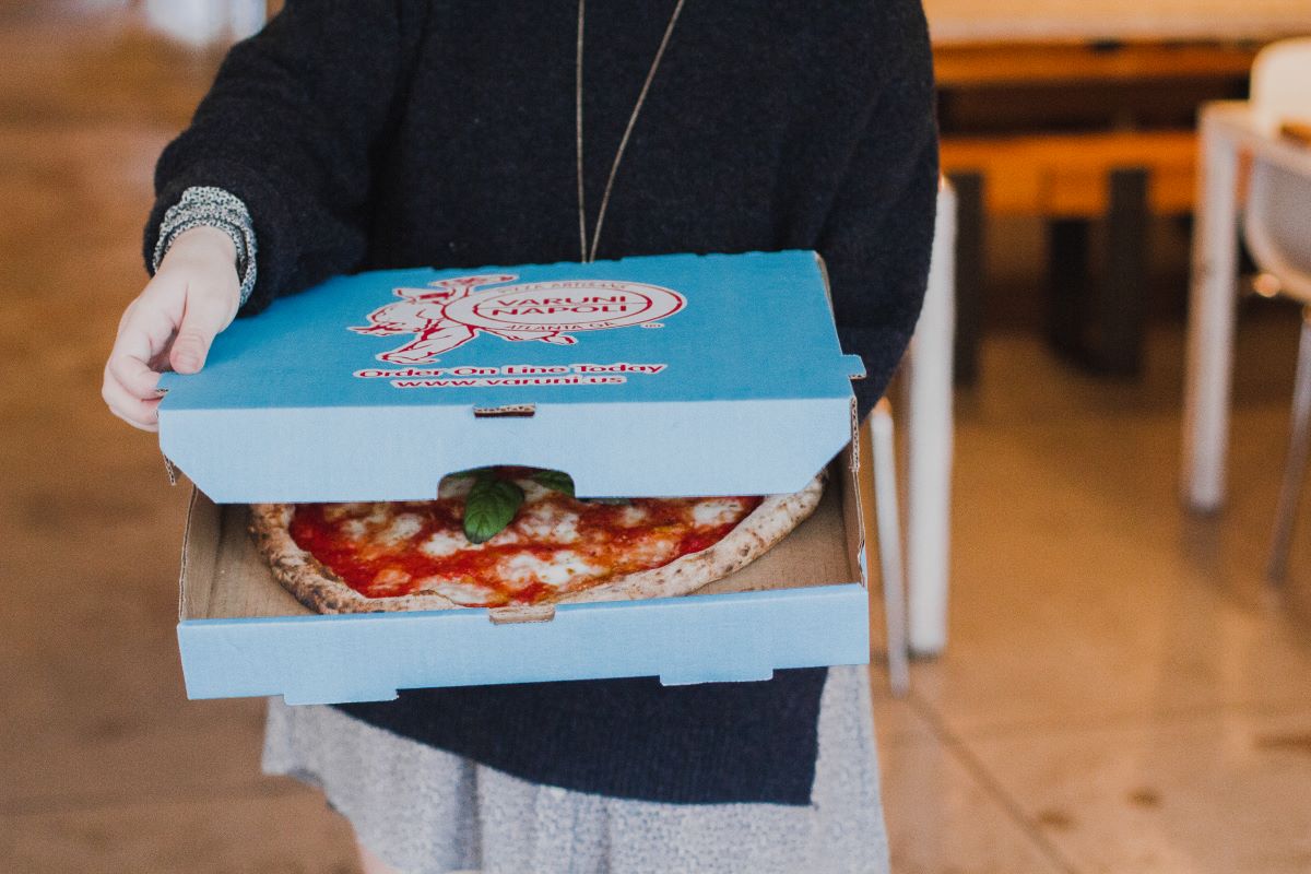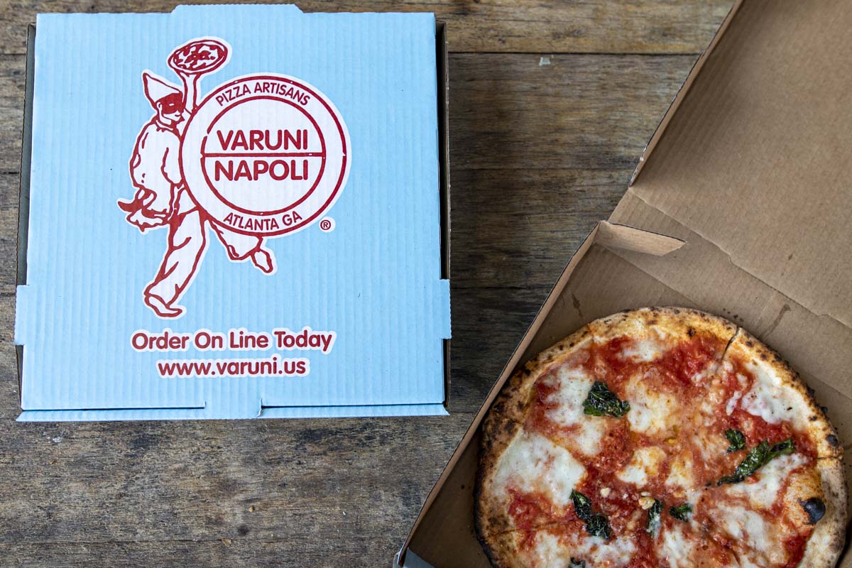 In Atlanta, a baby blue pizza box from Varuni Napoli signifies a delicious Neapolitan pizza. Designed by Chef Luca Varuni, the box’s blue color reflects his wife’s eyes and his Italian heritage, while the red and white logo symbolizes key pizza ingredients and elements of Italian culture. Inspired by Tiffany blue, the design aims to evoke excitement and a sense of specialness.