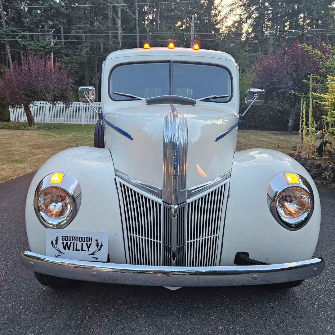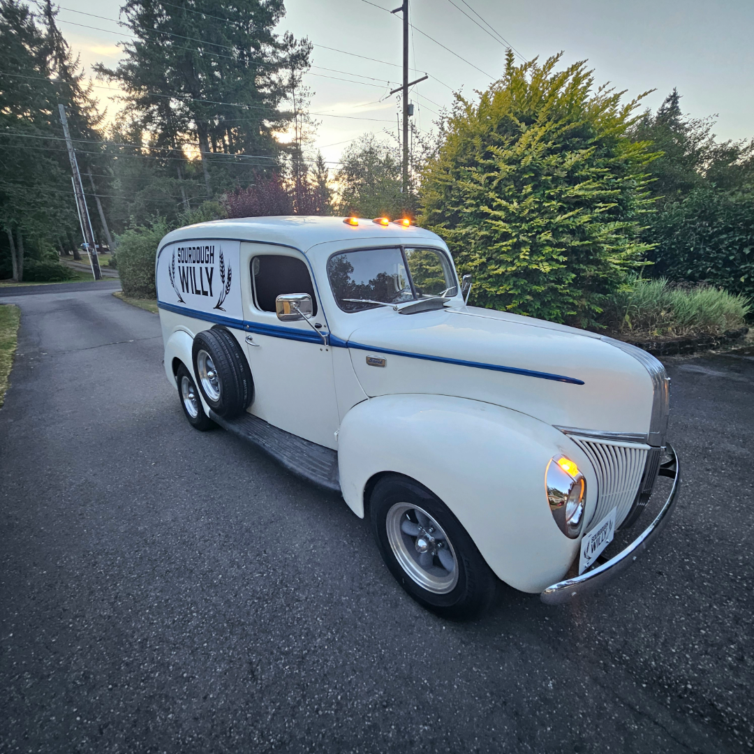 A 1941 Ford panel delivery truck with a Chevy small block engine a Mustang front end and a Caprice Rear End. This delivery vehicle is known throughout the community as the Sourdough Willie mobile.