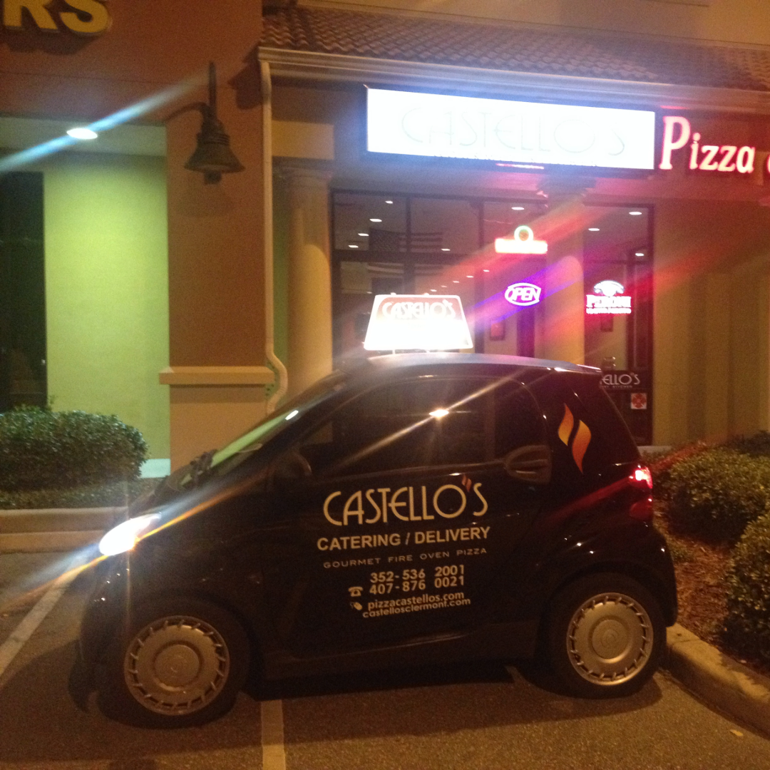 Castello’s Pizza turned a Smart car into a sleek, fully branded delivery vehicle that’s as iconic as it is practical. With its bold flame logo and eye-catching design, it’s a rolling billboard that delivers hot pizza and big smiles while showcasing the brand’s creativity and commitment to sustainability.