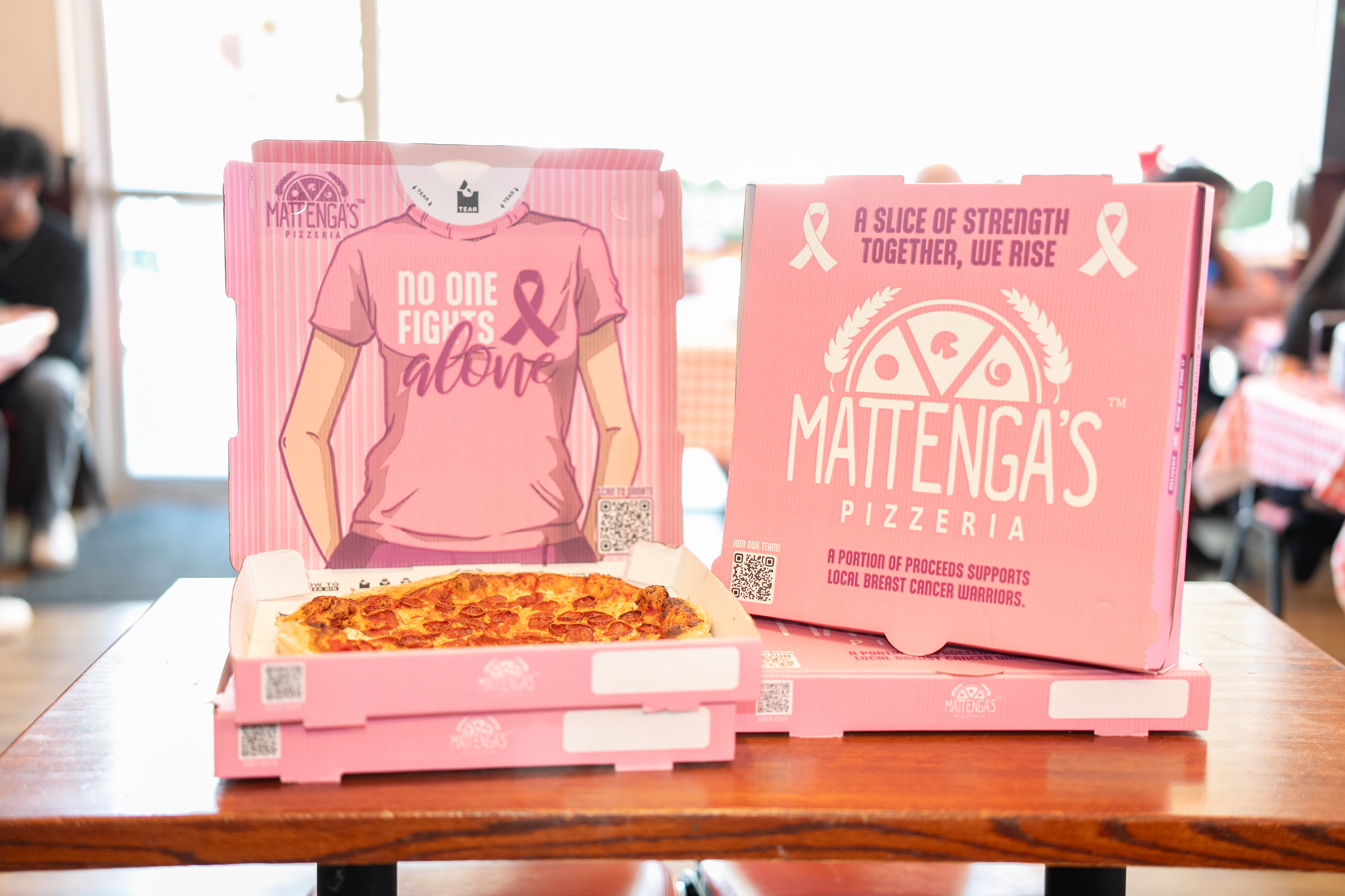 Mattenga’s Pizzeria created a heartfelt pizza box for National Pizza Month and Breast Cancer Awareness Month, spreading a message of hope and strength. The box’s exterior reads, “A Slice of Strength. Together, We Rise,” while the inside reminds, “No One Fights Alone.” More than packaging, it symbolizes Mattenga’s commitment to supporting breast cancer warriors, with proceeds from October sales aiding local survivors and families. Having served over 200 survivors at community events, Mattenga’s designed this box to inspire, unite, and share a story of love, strength, and community—because every pizza tells a story, and this one reminds us we’re stronger together.