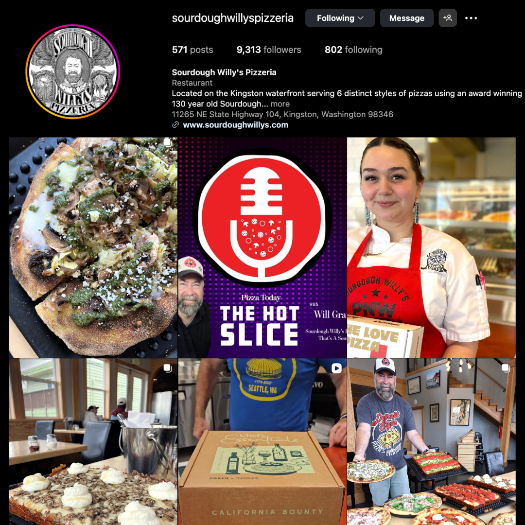 Sourdough Willy's social media presence stands out due to its emphasis on the unique, historical story of its 150-year-old Alaskan sourdough starter, behind the scenes look at the pizzeria and the numerous international awards and certifications earned by owner and Master Pizzaiolo Will Grant