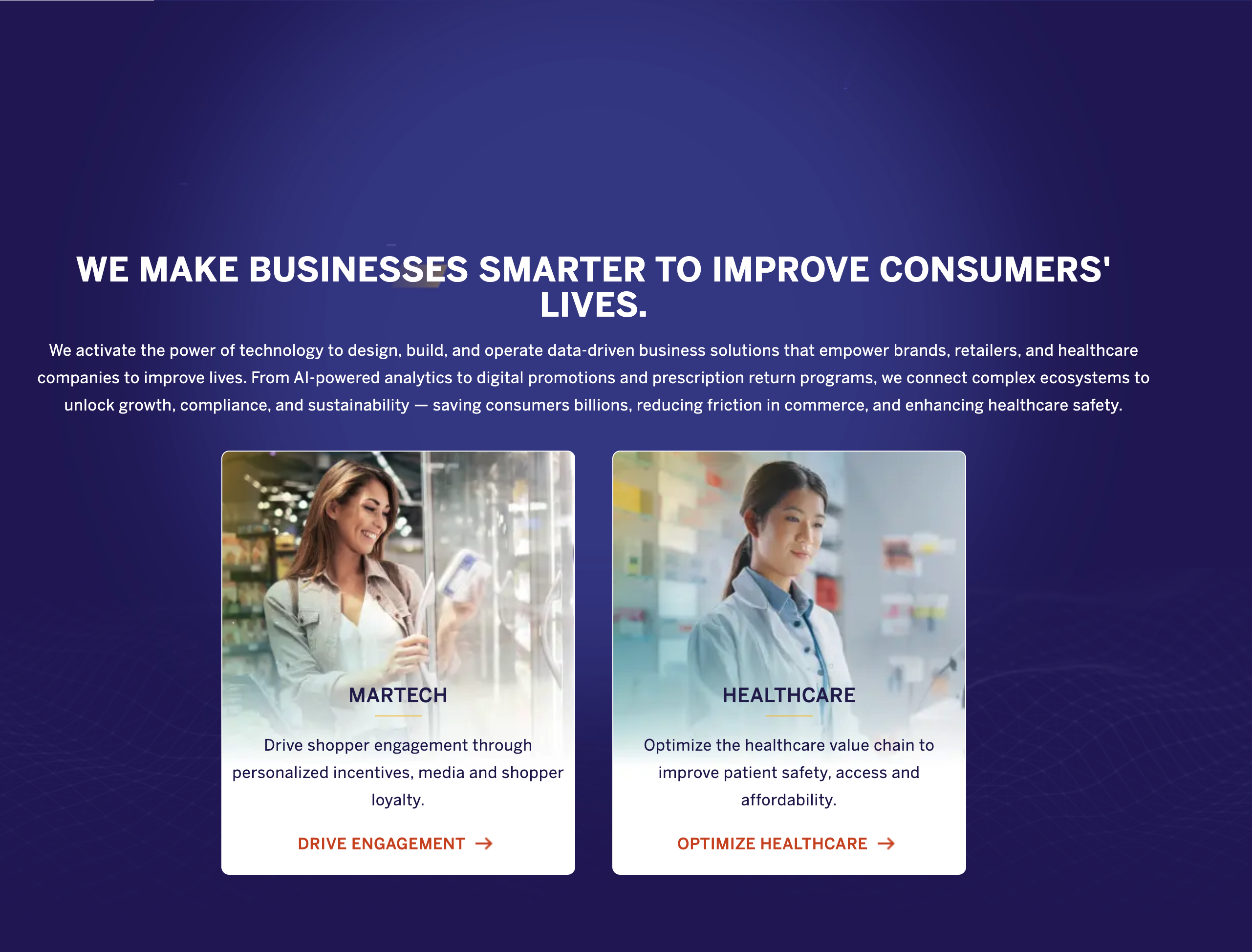 Through curiosity and the intelligent use of data and technology, we make businesses smarter to improve consumers' lives. As a trusted partner to brands and retailers for over 45 years, we design, build, and operate reliable, dynamic, and personalized media and incentive solutions that create greater efficiencies and unlock the potential of sophisticated marketplaces, helping shoppers save billions. Inmar leads in powering media, including retail media and influencer marketing, by seamlessly integrating first-party data into personalized campaigns.