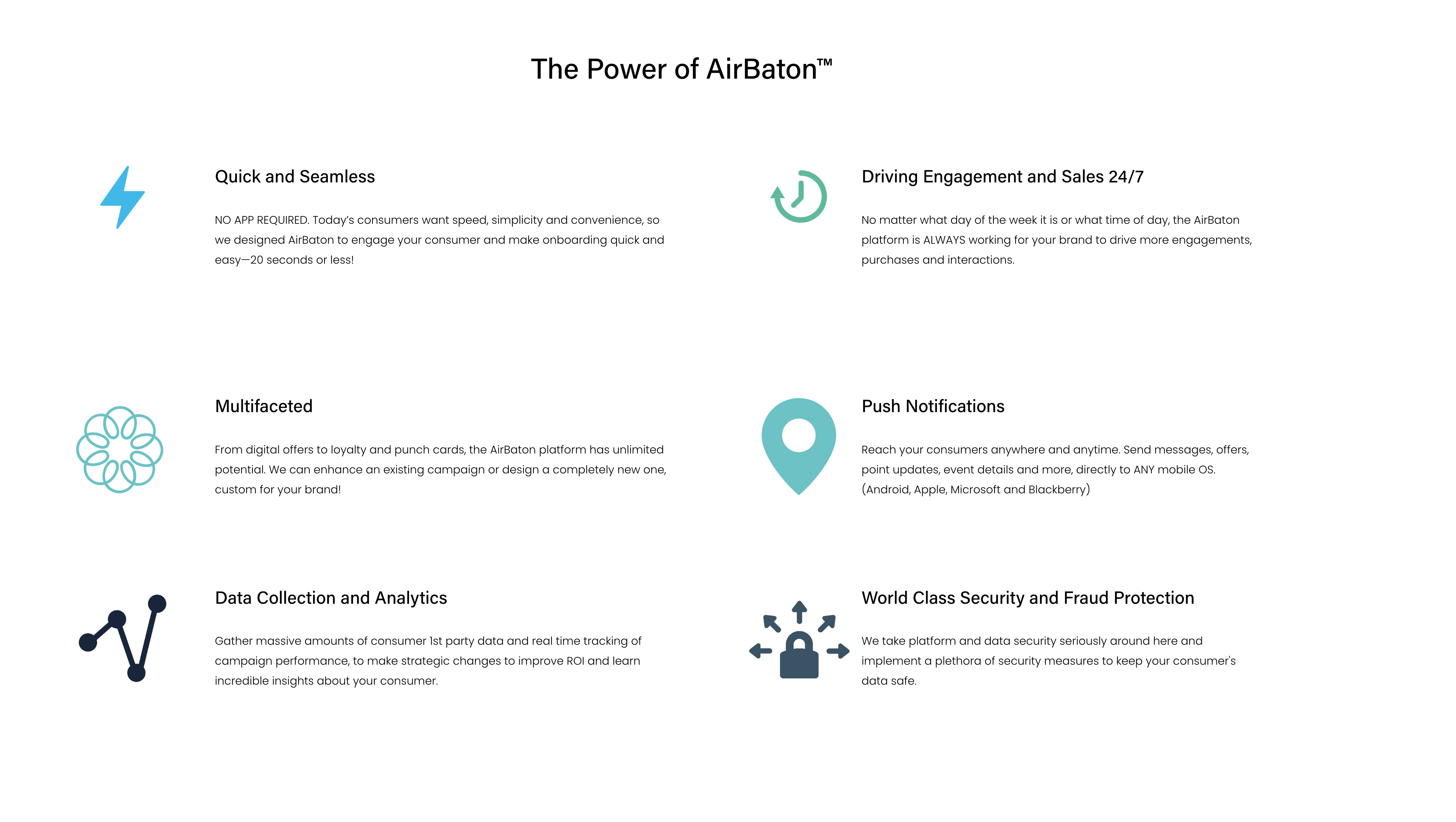 In today's market where retailers budget demands are increasing (owned apps, RMNs, circulars, etc.) we help brands take their power back. AirBaton is a no-app platform that turns disconnected rewards campaigns into powerful sales and loyalty engines. AirBaton can instantly validate purchases and deliver rewards, while capturing valuable first-party data in real time. From connected packaging to behavior driving promotions, we’ve cracked the code on frictionless engagement.