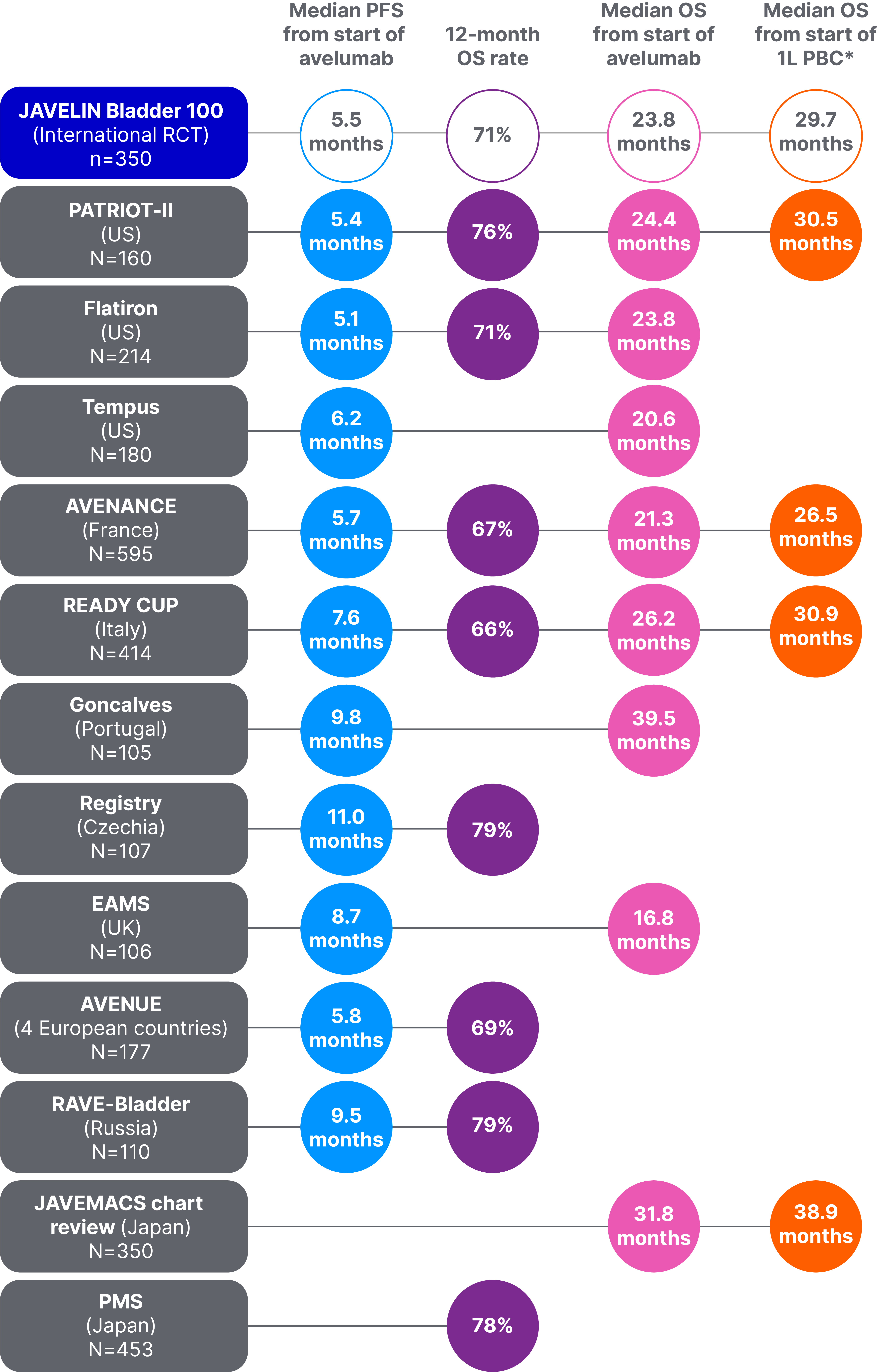 Survival outcomes reported in heterogeneous real-world study populations have been comparable to JAVELIN Bladder 100 Phase III trial results.