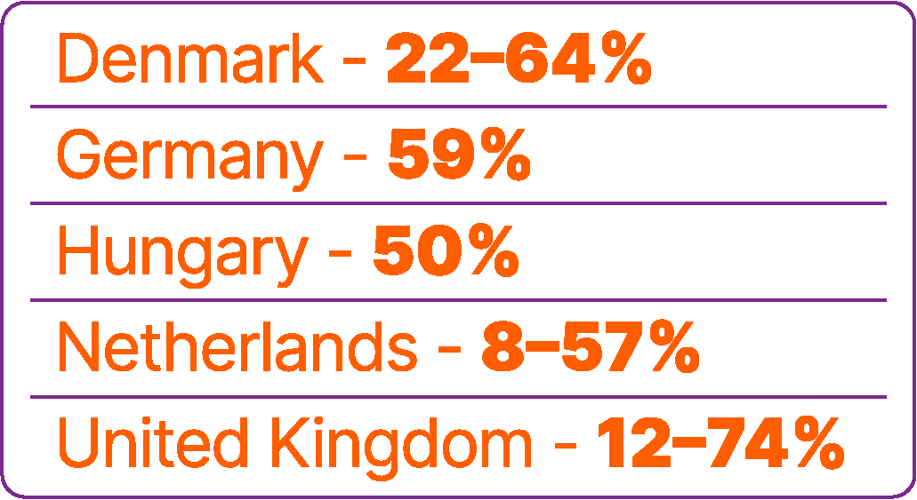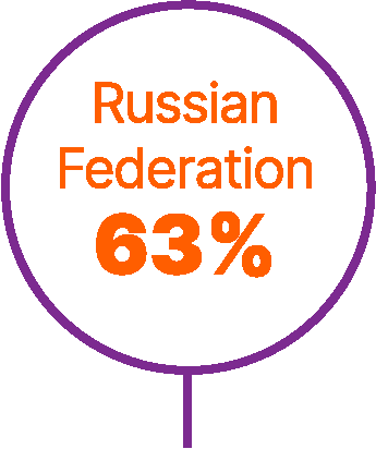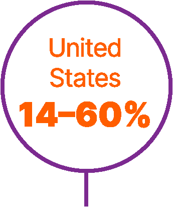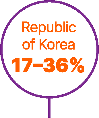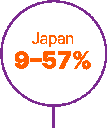 World map showing proportions of patients not receiving any systemic treatment for advanced urothelial carcinoma in different countries.6,9,56,57