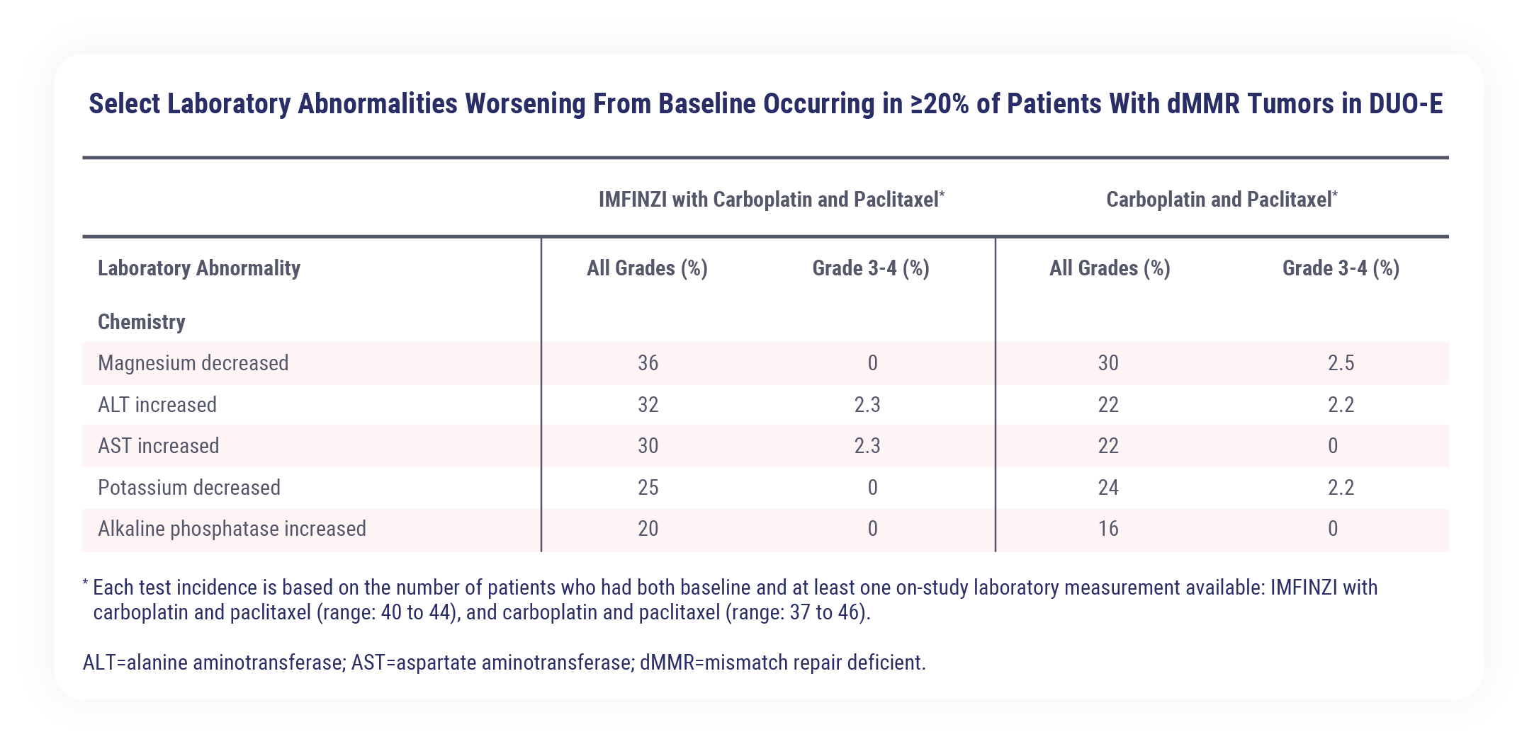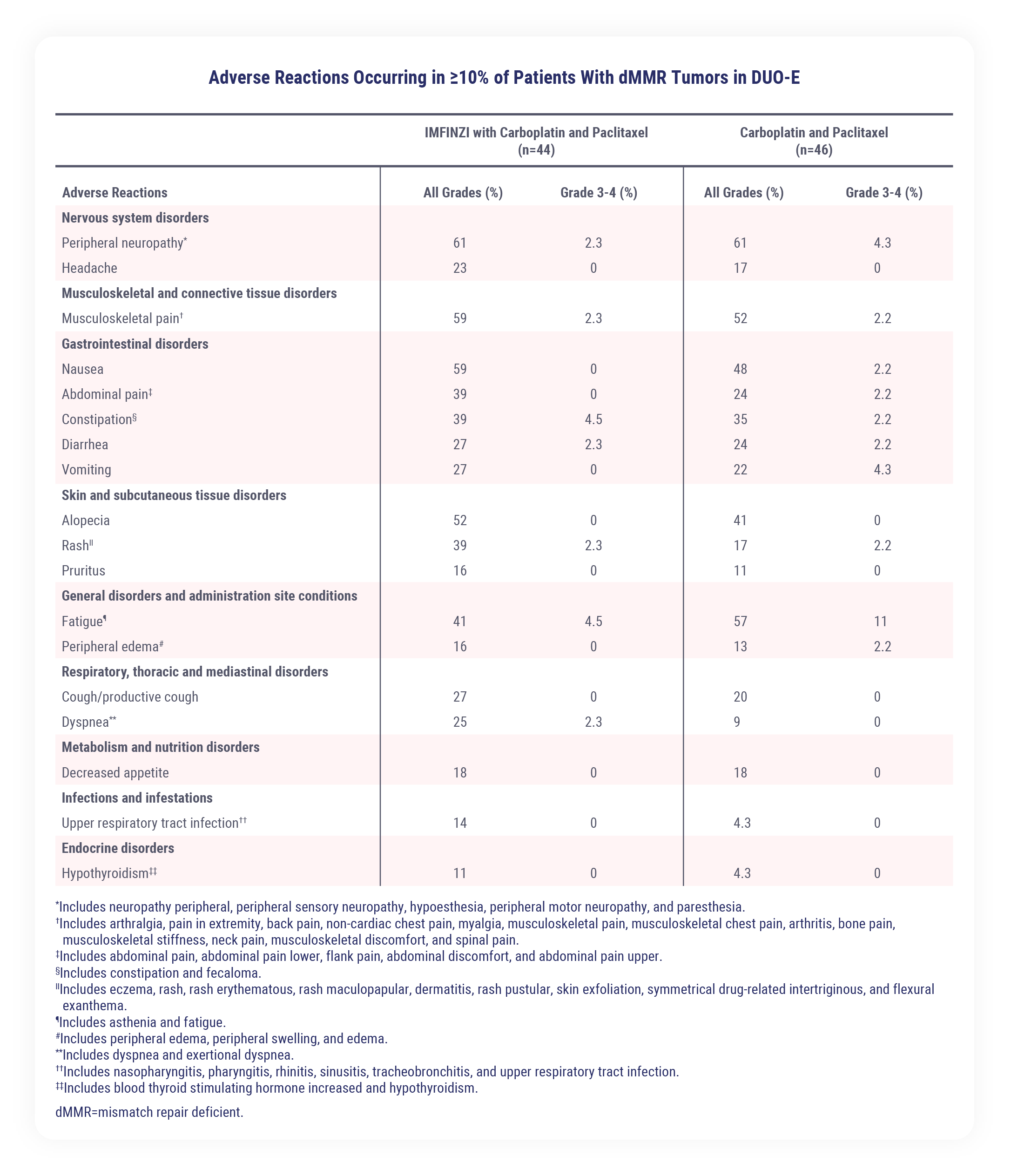 Safety data are available for a total of 44 patients with advanced or recurrent dMMR endometrial cancer who received IMFINZI with CP followed by IMFINZI as a single agent until disease progression or unacceptable toxicity. The median duration of exposure to IMFINZI with CP was 14.8 months, with a range of 0.7 to 31.7 months, in the dMMR subgroup.1