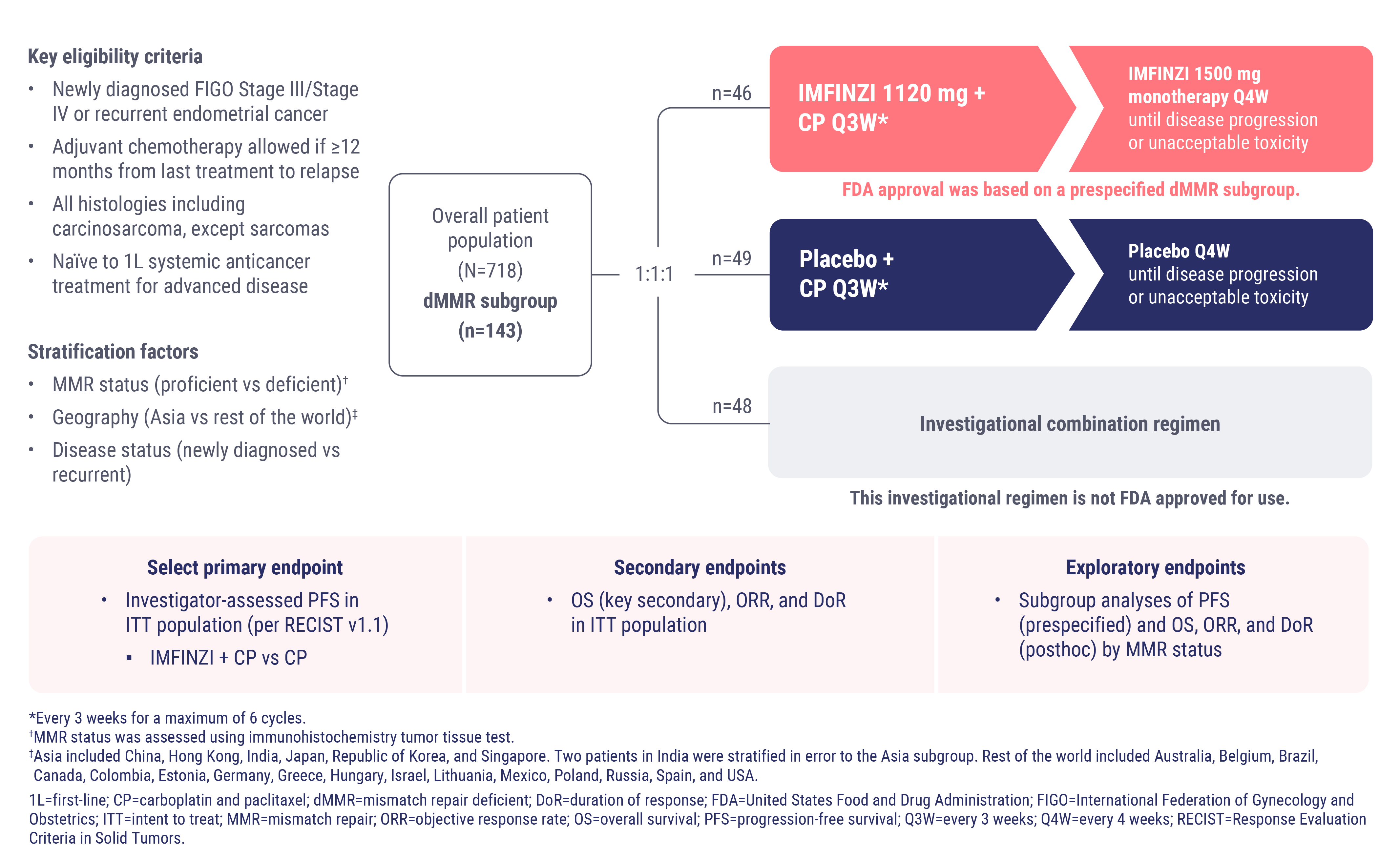 As of June 2024, the FDA approved IMFINZI® (durvalumab) in combination with carboplatin and paclitaxel (CP) followed by IMFINZI as a single agent for the treatment of adult patients with primary advanced or recurrent endometrial cancer that is mismatch repair deficient (dMMR).
