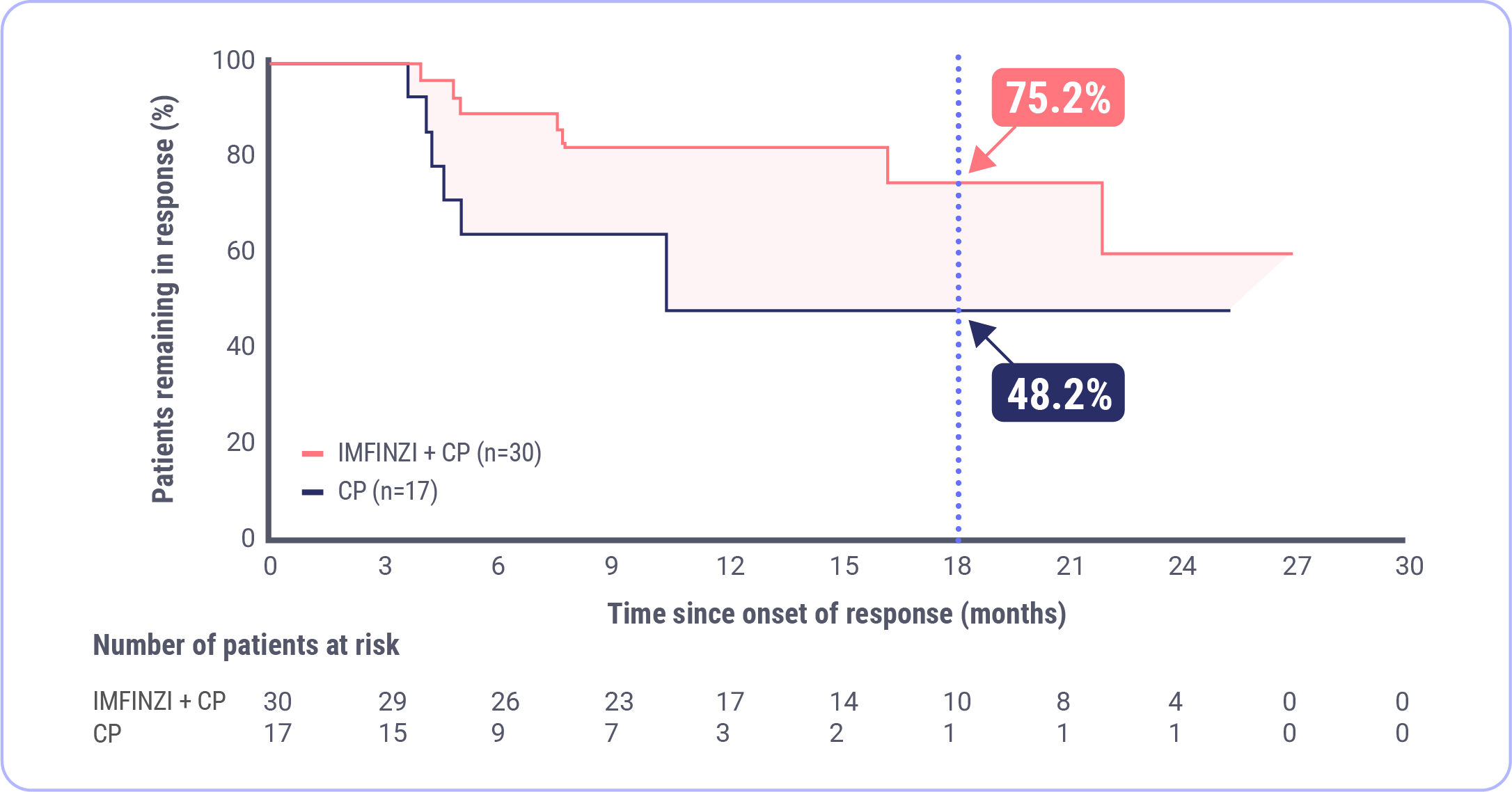 The median duration of response (DoR) was not reached in the IMFINZI + CP arm and 10.5 months in the CP arm.
