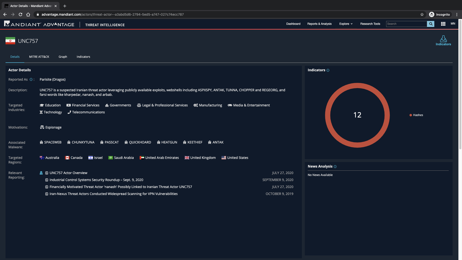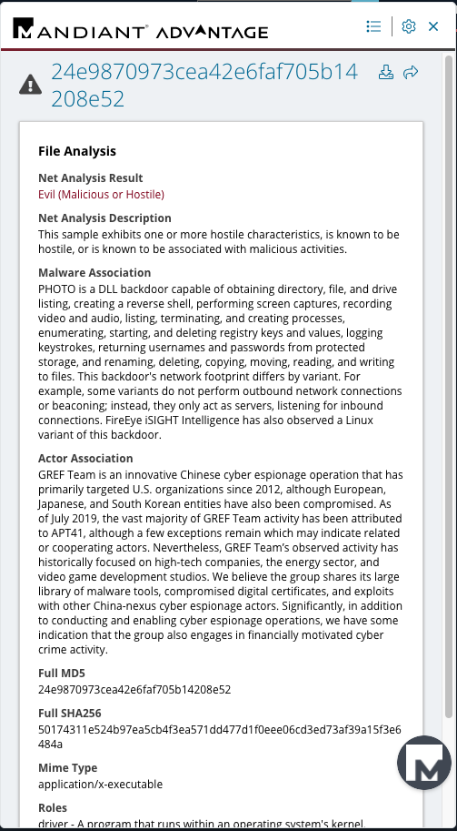 You reach the indicator page within Mandiant Advantage and see it is associated with a known threat group and malware.