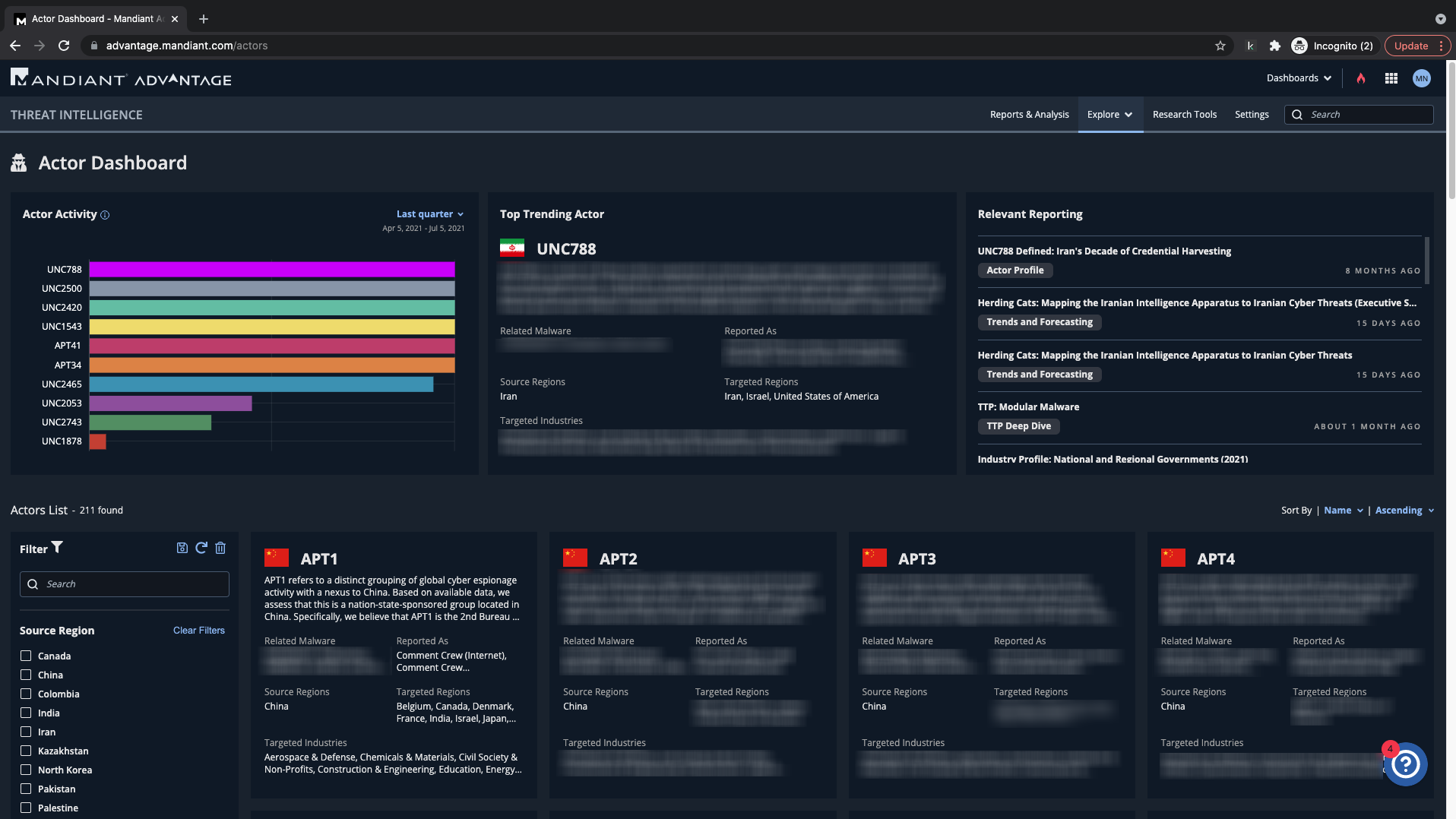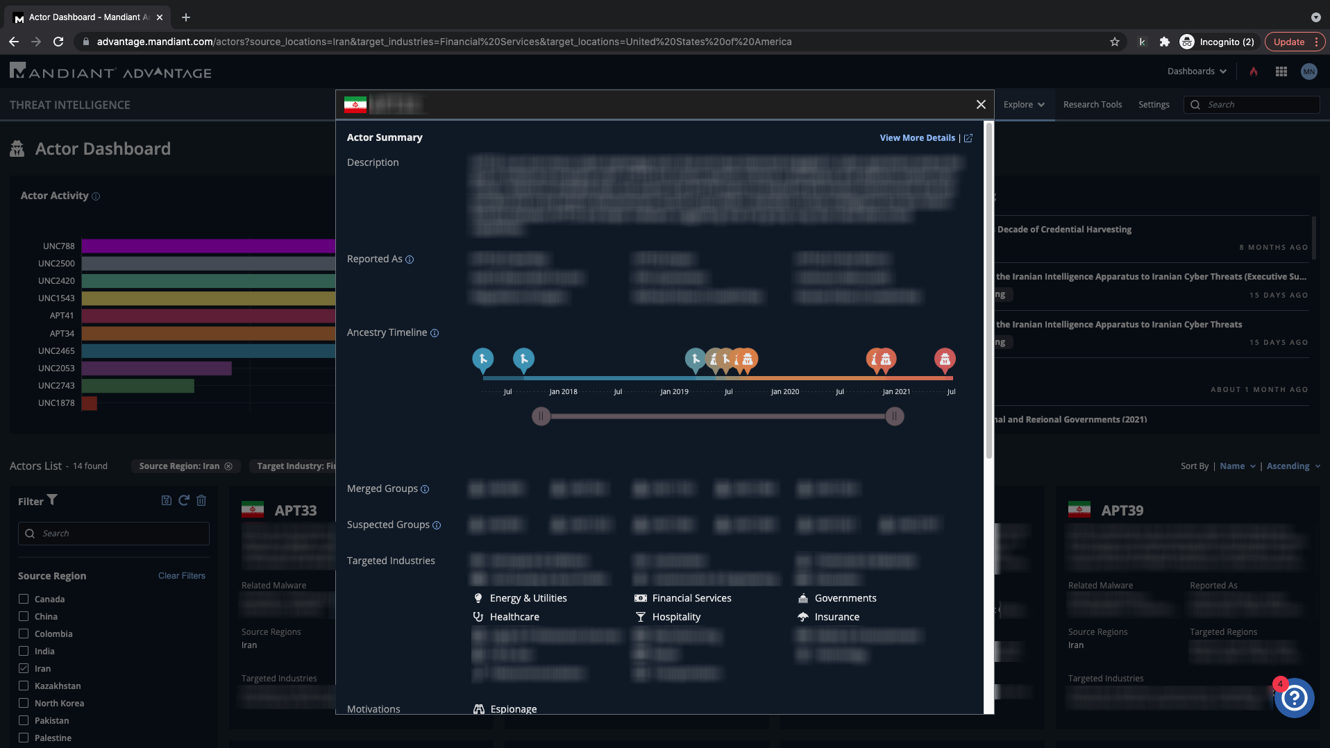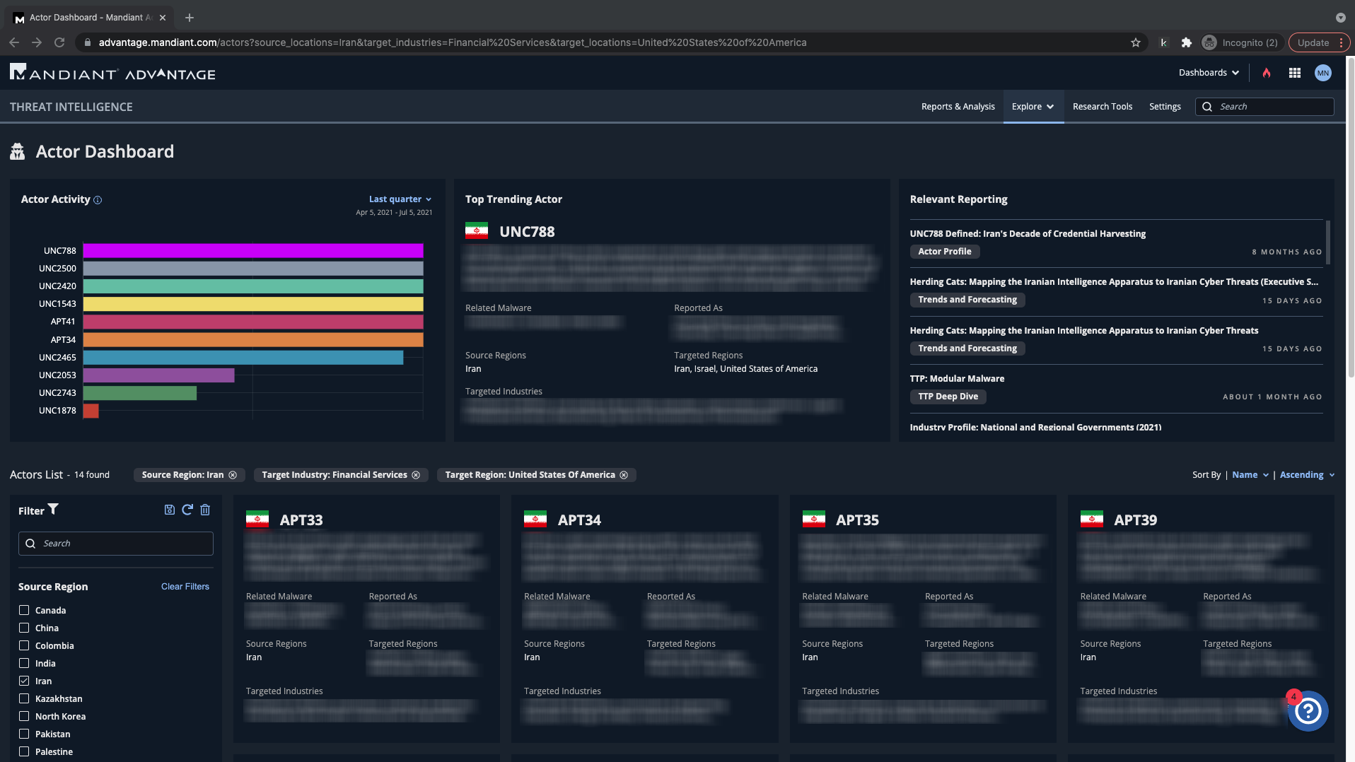 Prompted by major headline news, you're interested in Iranian threats against your organization. Through our Actor Dashboard you begin to customize your search.