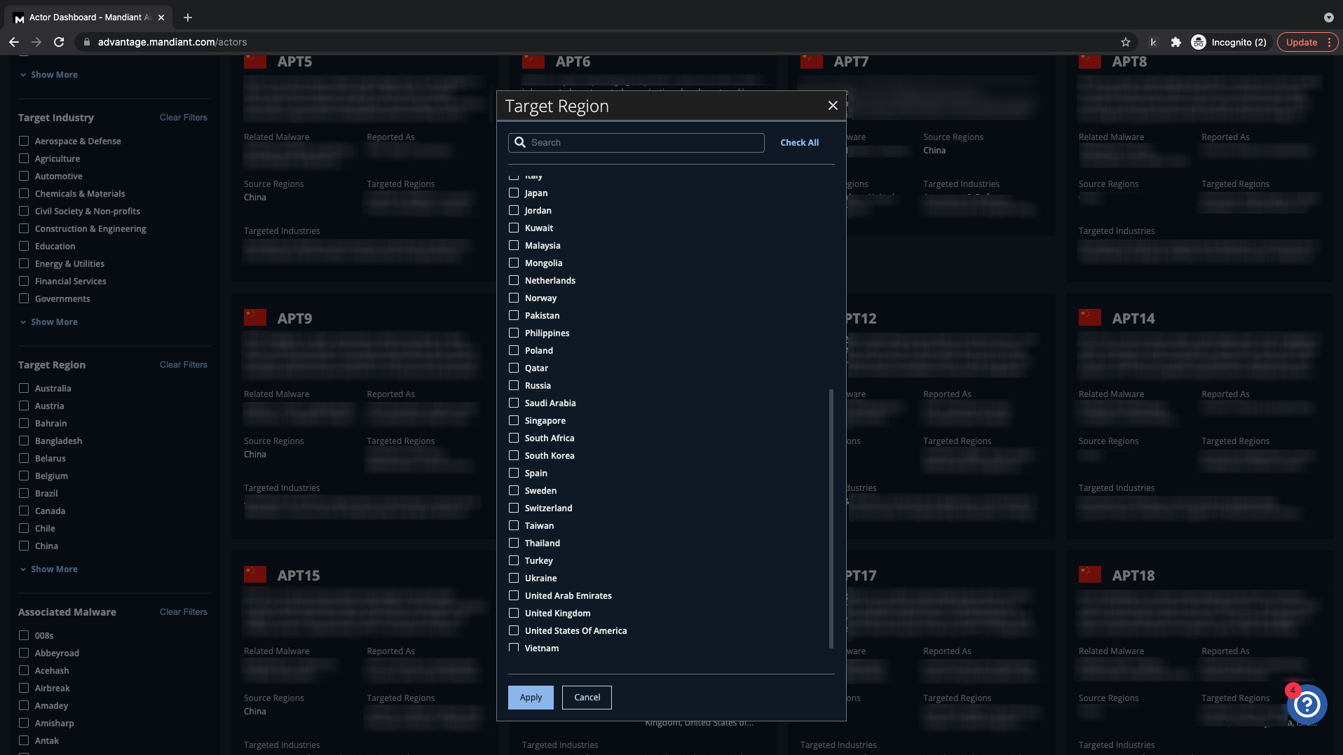 You can filter by Target Region, Source Region, Target Industry and Associated Malware.