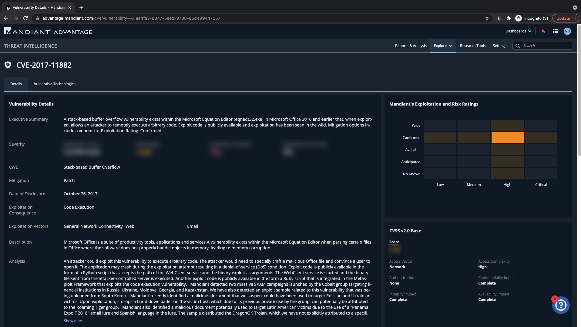 You find information that will allow you to prioritize the severity of the vulnerability, and now understand which technologies are vulnerable.