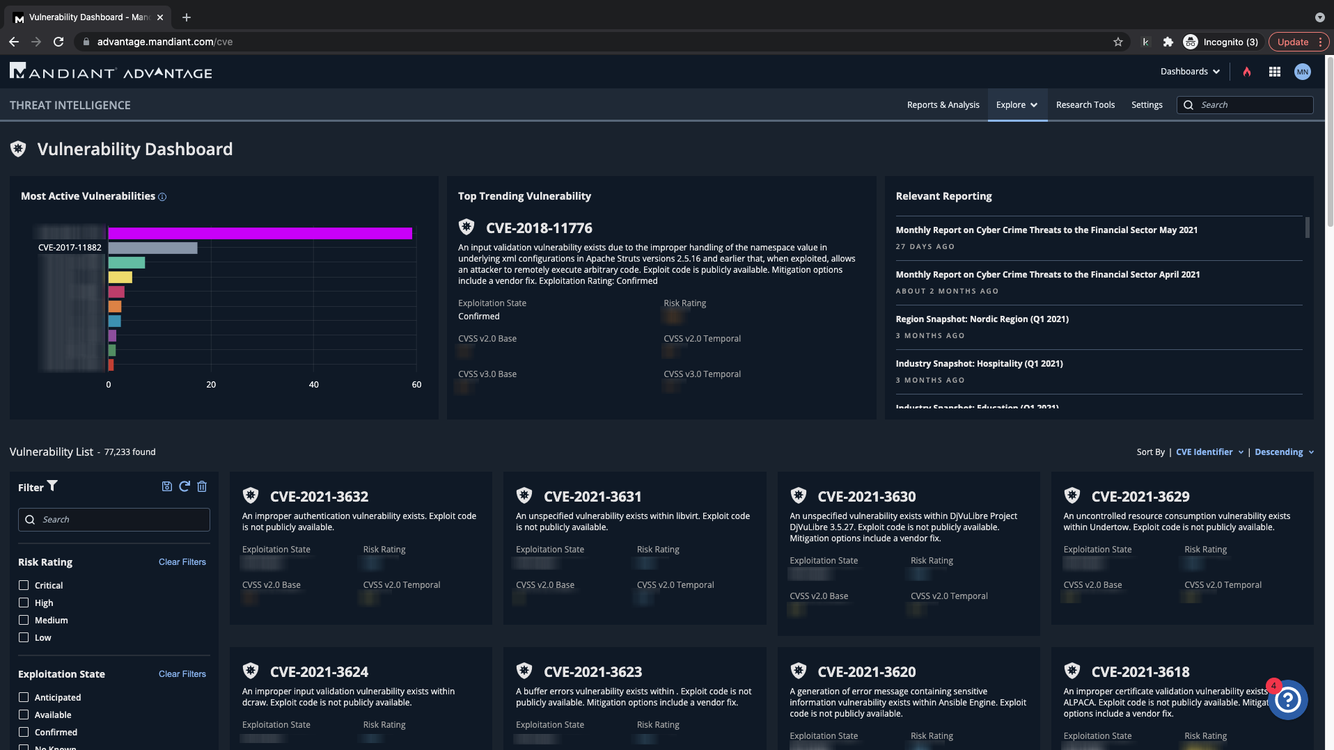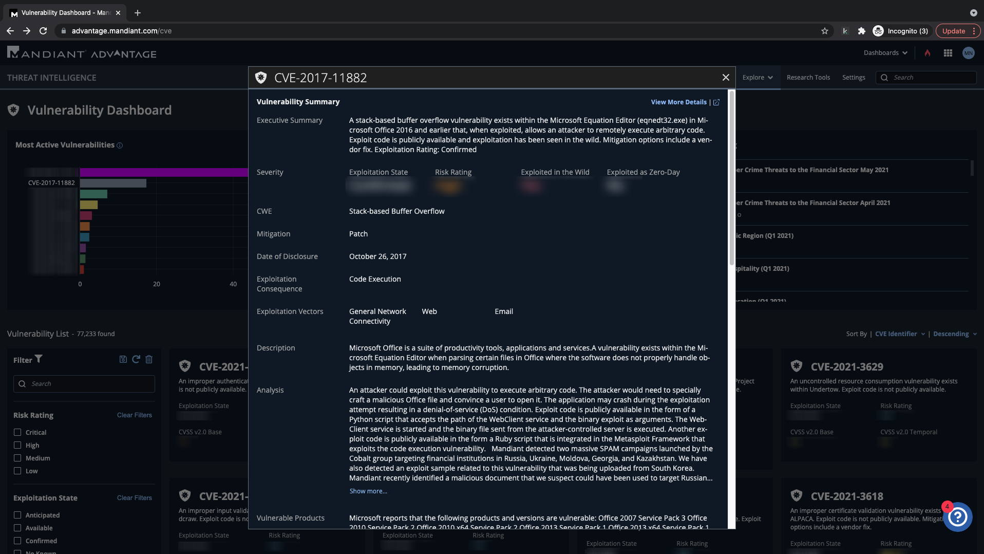 You find a vulnerability of interest marked in the Most Active Vulnerabilities section of the Vulnerabiity Dashboard.