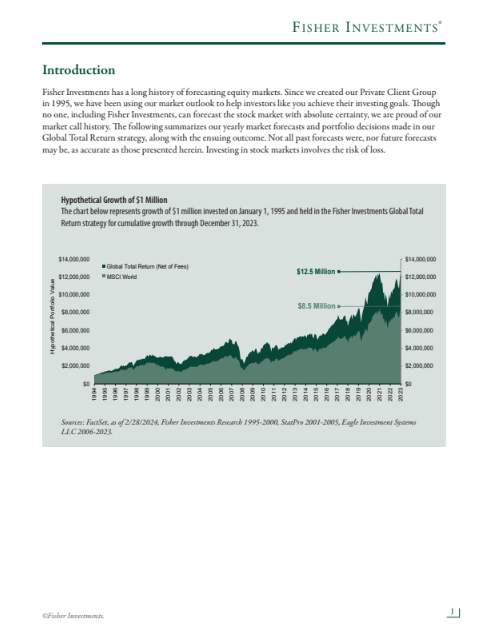 Fisher Investments has a long history of forecasting equity markets. Since we began managing money for private clients in 1995, we have been using our market outlook to help investors achieve their investing goals.