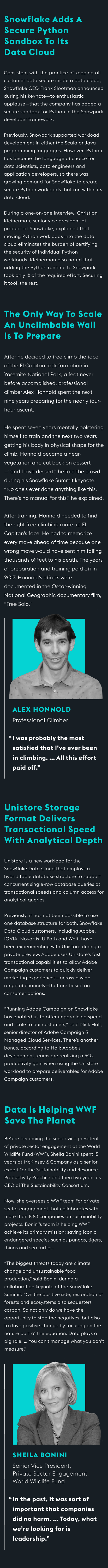 Consistent with the practice of keeping all customer data secure inside a data cloud, Snowflake CEO Frank Slootman announced during his keynote—to enthusiastic applause—that the company has added a secure sandbox for Python in the Snowpark developer framework.