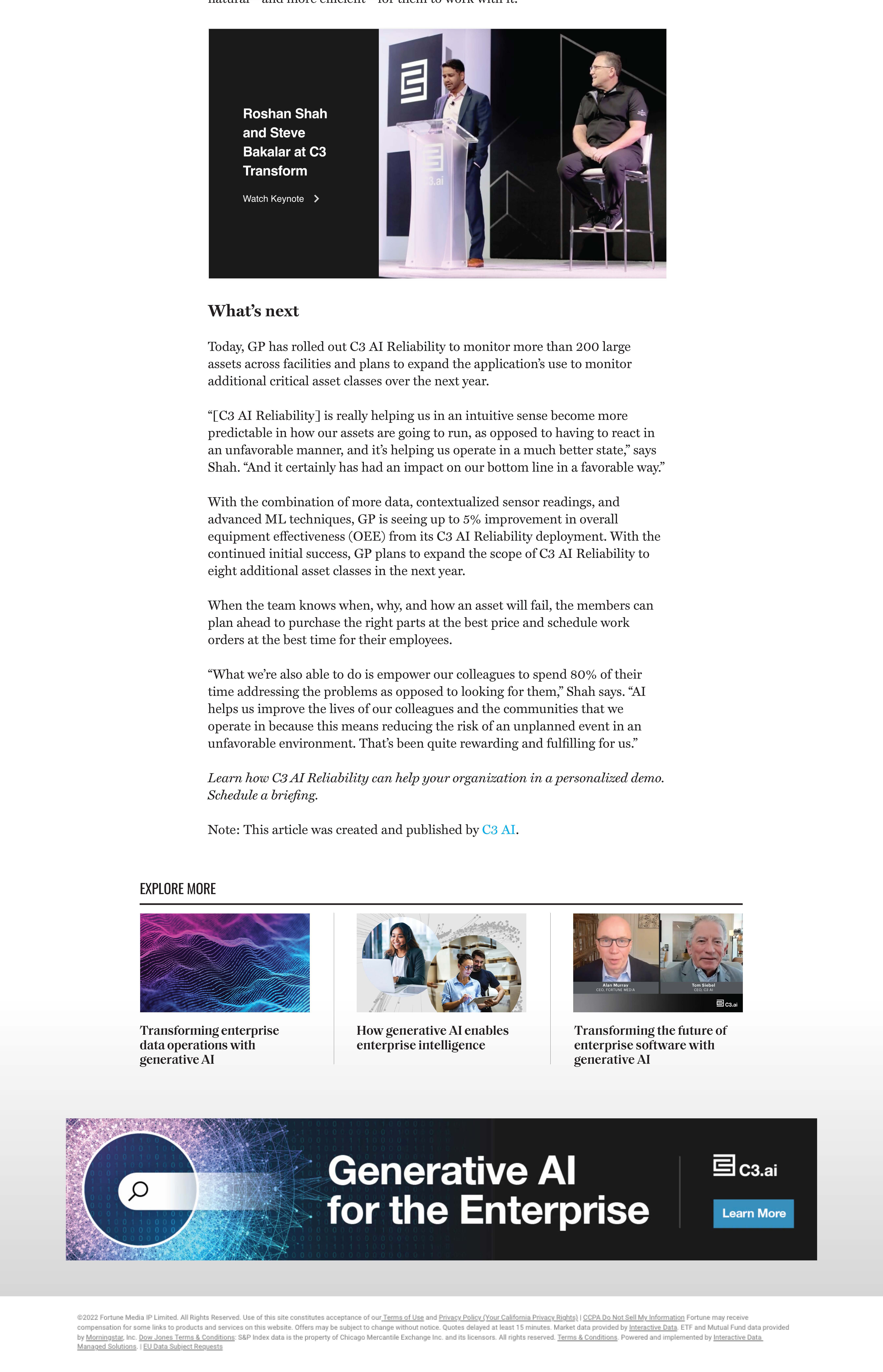 Today, GP has rolled out C3 AI Reliability to monitor more than 200 large assets across facilities and plans to expand the application’s use to monitor additional critical asset classes over the next year.