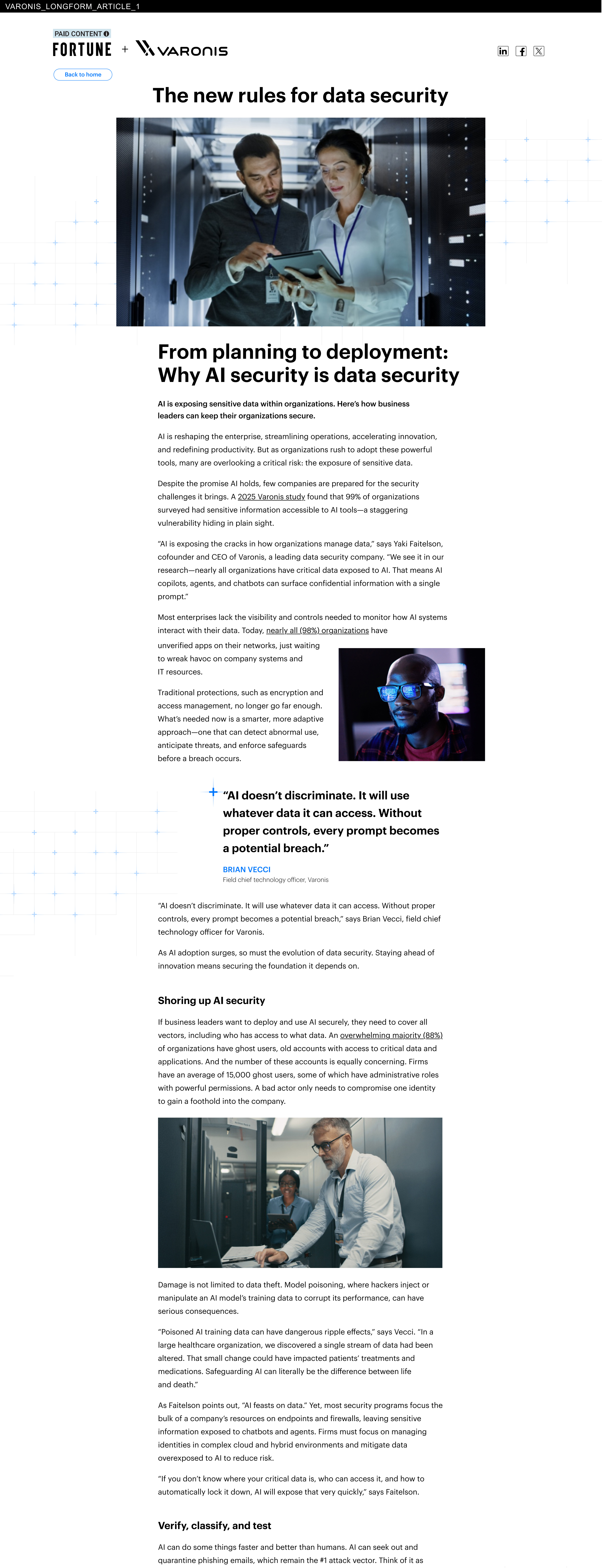 “AI is exposing the cracks in how organizations manage data,” says Yaki Faitelson, cofounder and CEO of Varonis, a leading data security company. “We see it in our research—nearly all organizations have critical data exposed to AI. That means AI copilots, agents, and chatbots can surface confidential information with a single prompt.”