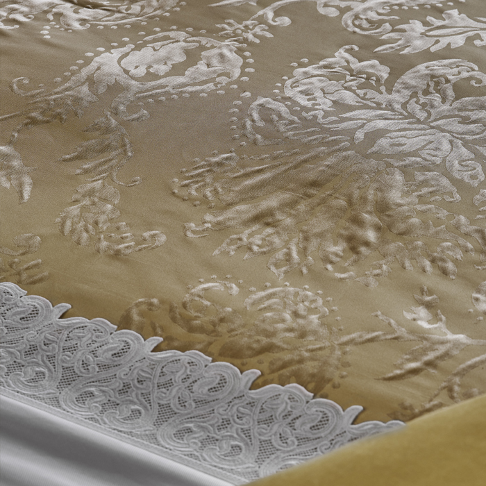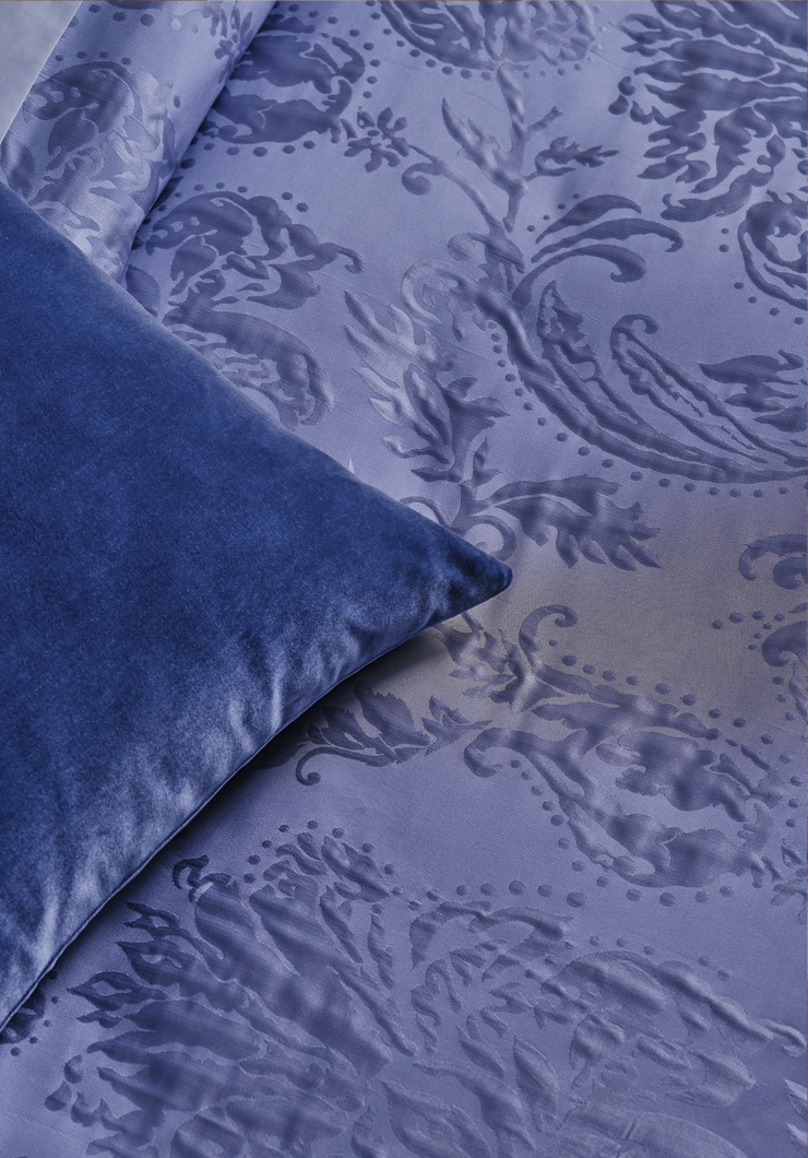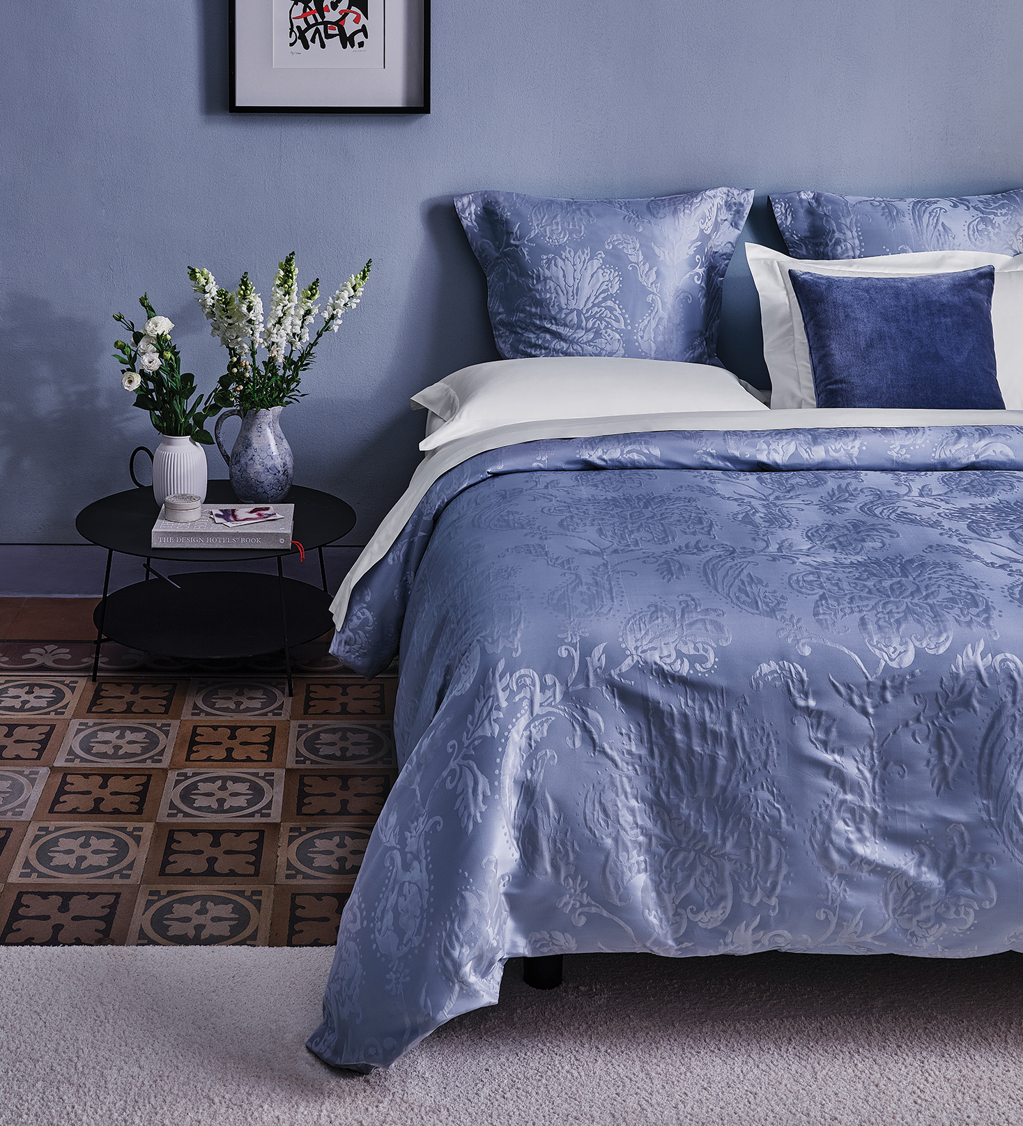 The Luxury Brocade collection features a regal motif design on silk brocade pieces, creating a statement-making bed ensemble.