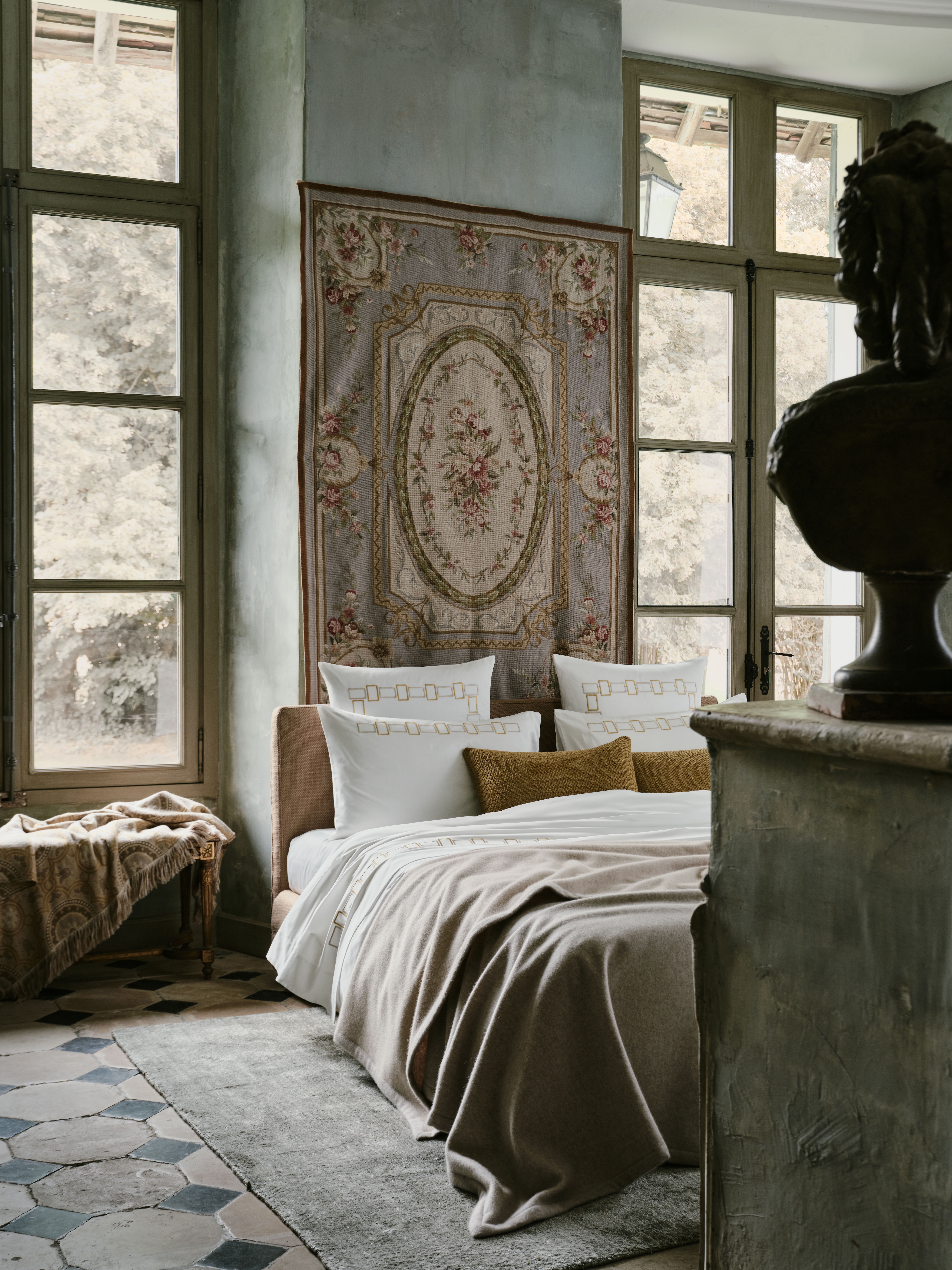 Photographed in a quintessentially grand Parisian residence, the first chapter of the collection highlights bed linens draped with a weighted grace and reveals textures in dusty tones.