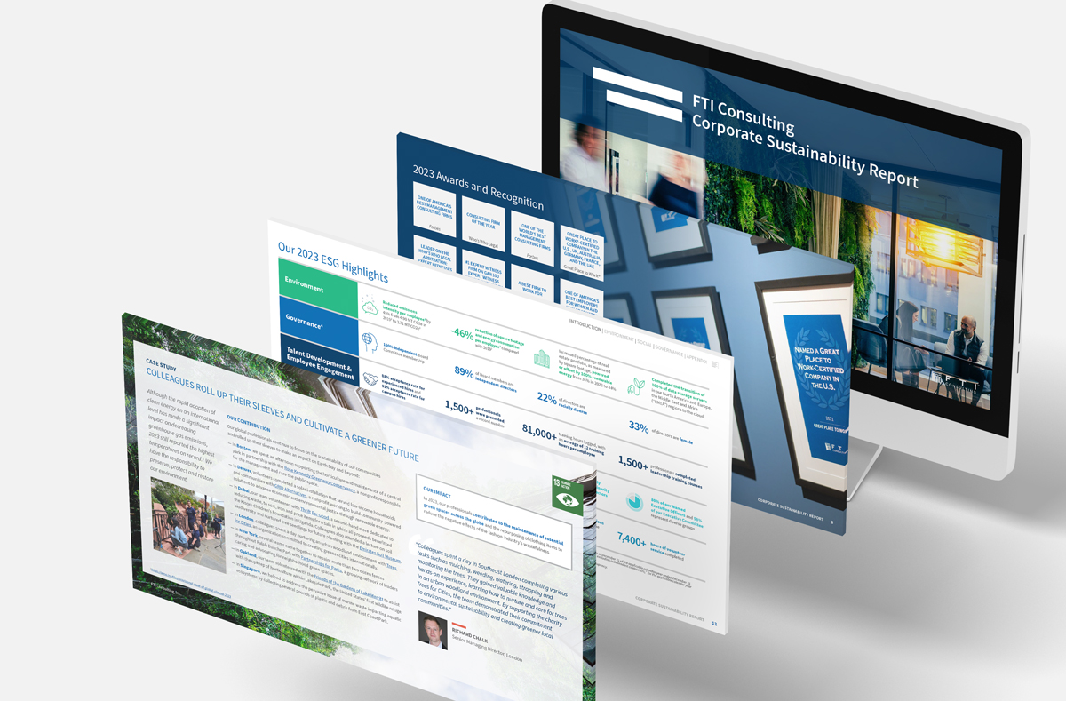 FTI Consulting’s 2023 Corporate Sustainability Report highlights our approach to addressing our company’s unique environmental, social and governance characteristics through our related programs, policies and commitments.