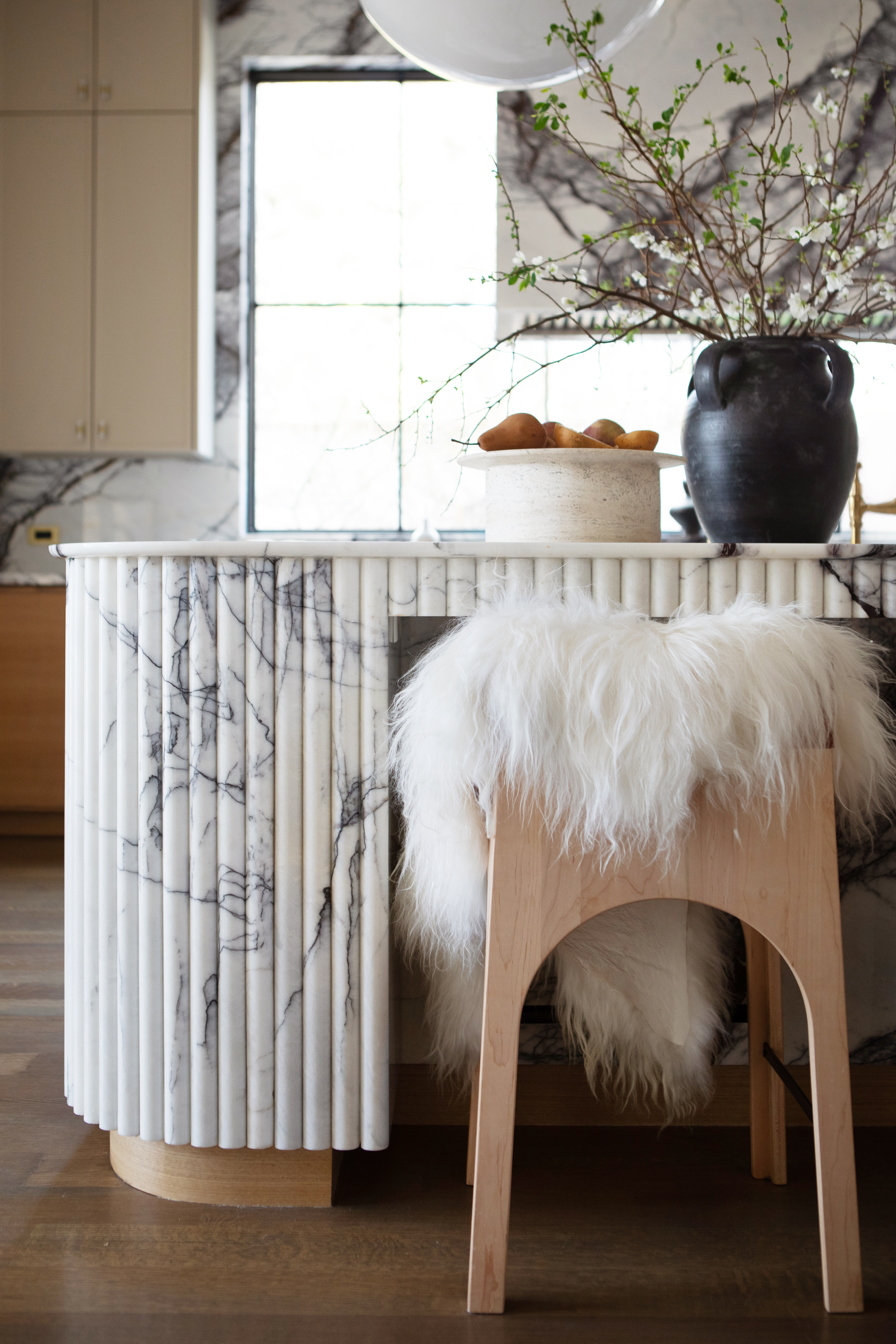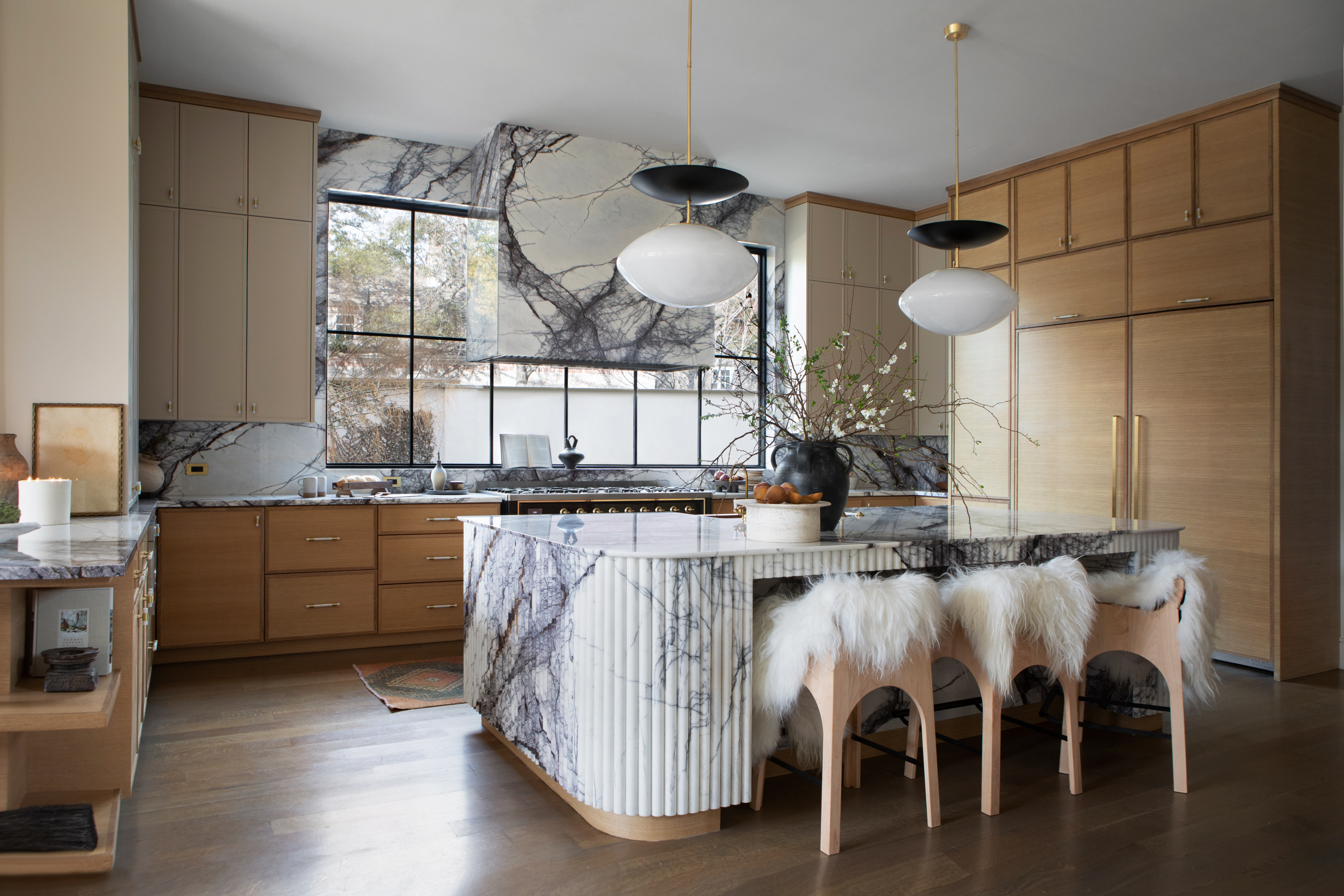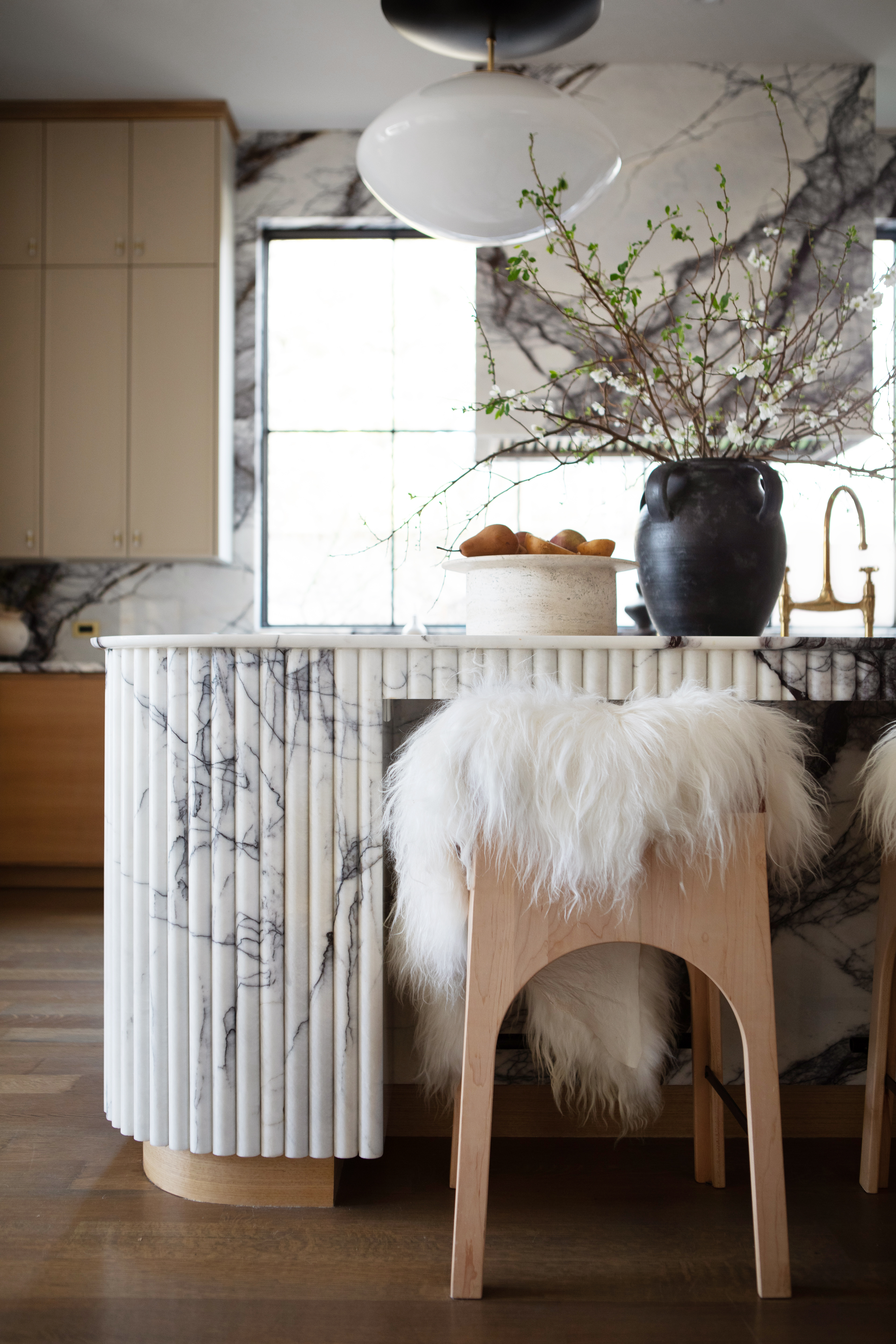 Despite its inflated title, loud luxury has nothing to do with boorish color or pattern. It favors materials in similar, understated tones with contrasting textures that add depth and drama. This is mainly showing up with dramatic marble veining and dark wood finishes. The sophistication comes from the foundation of the kitchen itself, where islands, cabinets and appliances act as statement pieces on their own (though many have some gorgeous lighting overhead that can double as artwork). As for fabrics, there are a few tried-and-true textures that make an impact without sacrificing a curated feel: linen, leather, tweed, velvet and shearling. While linen and leather offer more of an organic modern vibe, tonal tweed and rich velvet can skew midcentury modern. Not to mention that adding a pop of shearling to a dark leather chair is a one-way ticket to nailing an Aspen ski chalet aesthetic. When talking about loud luxury, it’s also worth mentioning fluted details, which are so subtle, that you could almost miss them, but manifest as a ribbed, accordion-like texture that’s achieved through rows of vertical grooves—and we’ve seen them popping up everywhere from cabinets to islands to backsplashes. Not only is it a perfect example of how loud luxury draws the eye without overpowering a space, but it also speaks to the custom, bespoke feel that makes the trend unique and personal.