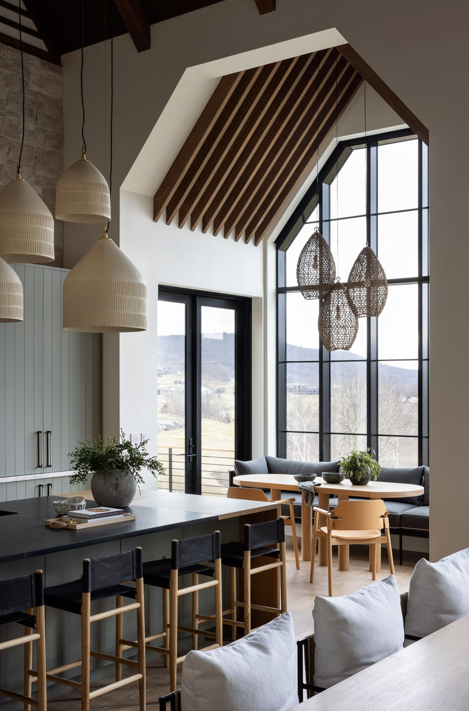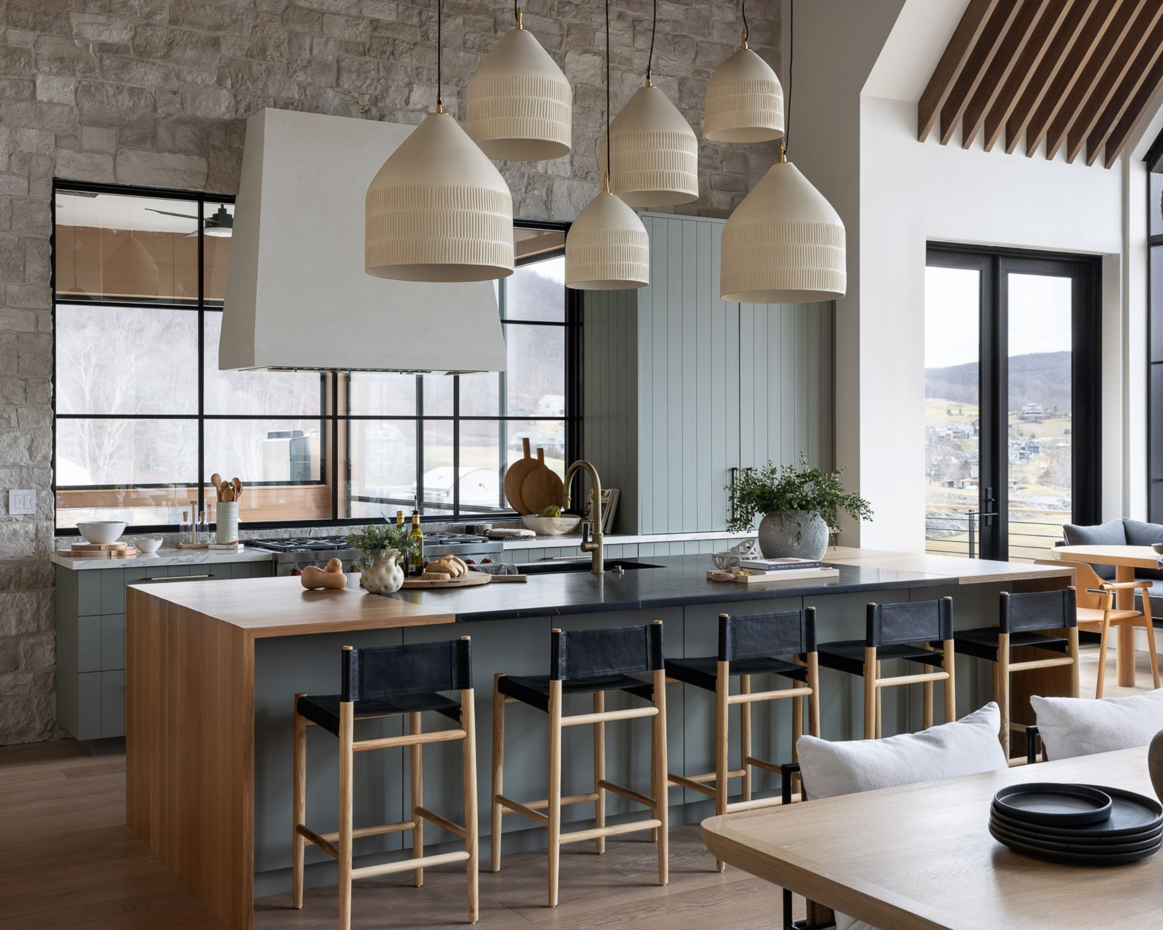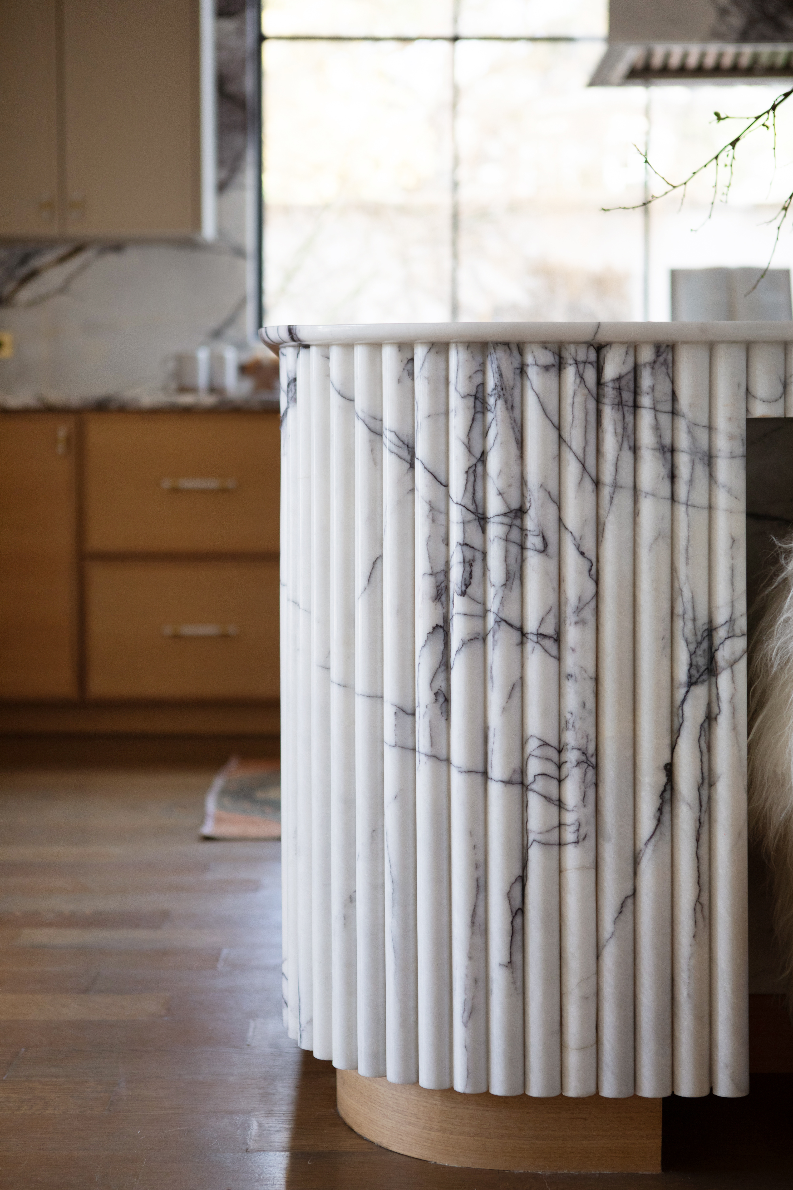 Despite its inflated title, loud luxury has nothing to do with boorish color or pattern. It favors materials in similar, understated tones with contrasting textures that add depth and drama. This is mainly showing up with dramatic marble veining and dark wood finishes. The sophistication comes from the foundation of the kitchen itself, where islands, cabinets and appliances act as statement pieces on their own (though many have some gorgeous lighting overhead that can double as artwork). As for fabrics, there are a few tried-and-true textures that make an impact without sacrificing a curated feel: linen, leather, tweed, velvet and shearling. While linen and leather offer more of an organic modern vibe, tonal tweed and rich velvet can skew midcentury modern. Not to mention that adding a pop of shearling to a dark leather chair is a one-way ticket to nailing an Aspen ski chalet aesthetic. When talking about loud luxury, it’s also worth mentioning fluted details, which are so subtle, that you could almost miss them, but manifest as a ribbed, accordion-like texture that’s achieved through rows of vertical grooves—and we’ve seen them popping up everywhere from cabinets to islands to backsplashes. Not only is it a perfect example of how loud luxury draws the eye without overpowering a space, but it also speaks to the custom, bespoke feel that makes the trend unique and personal.